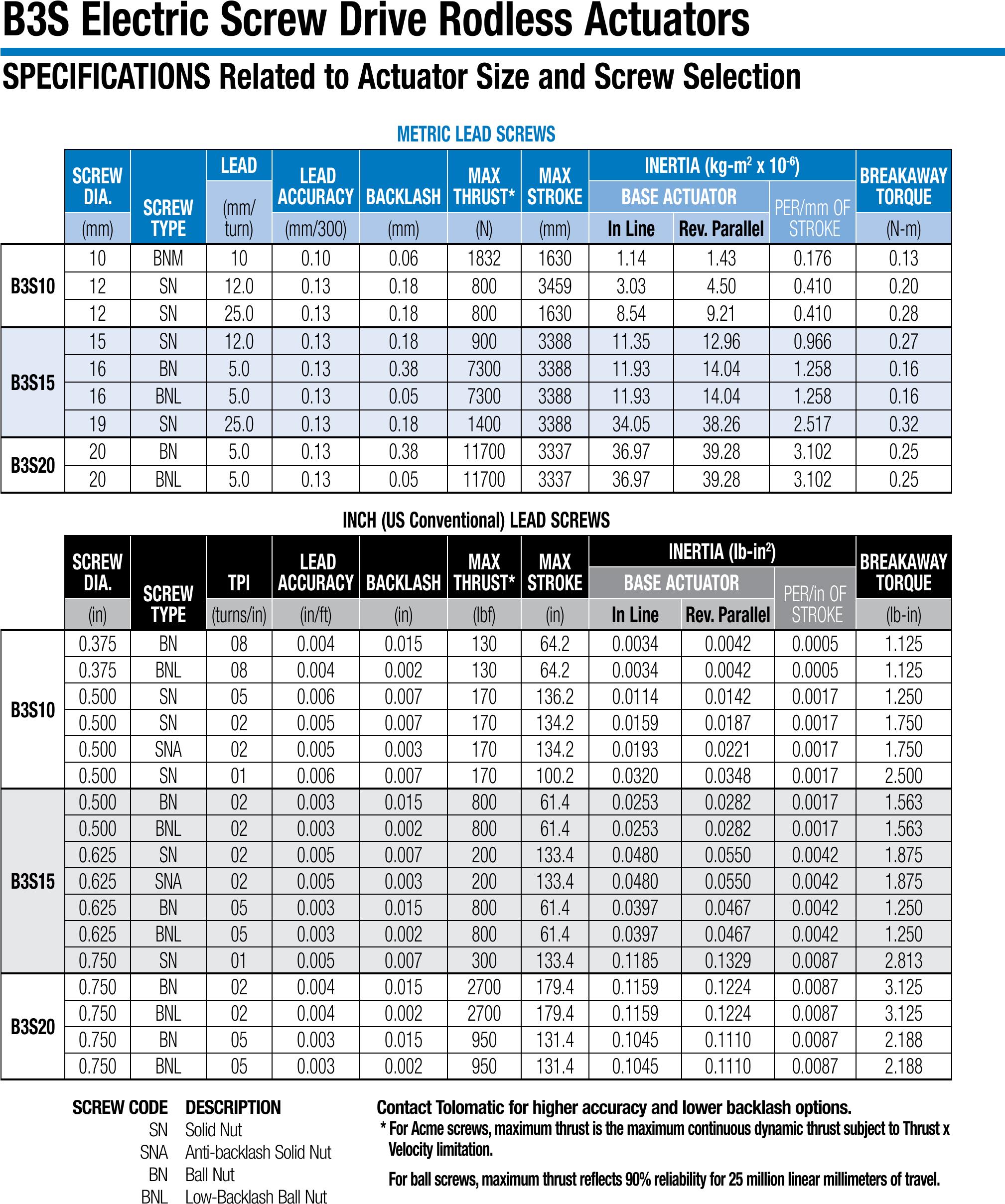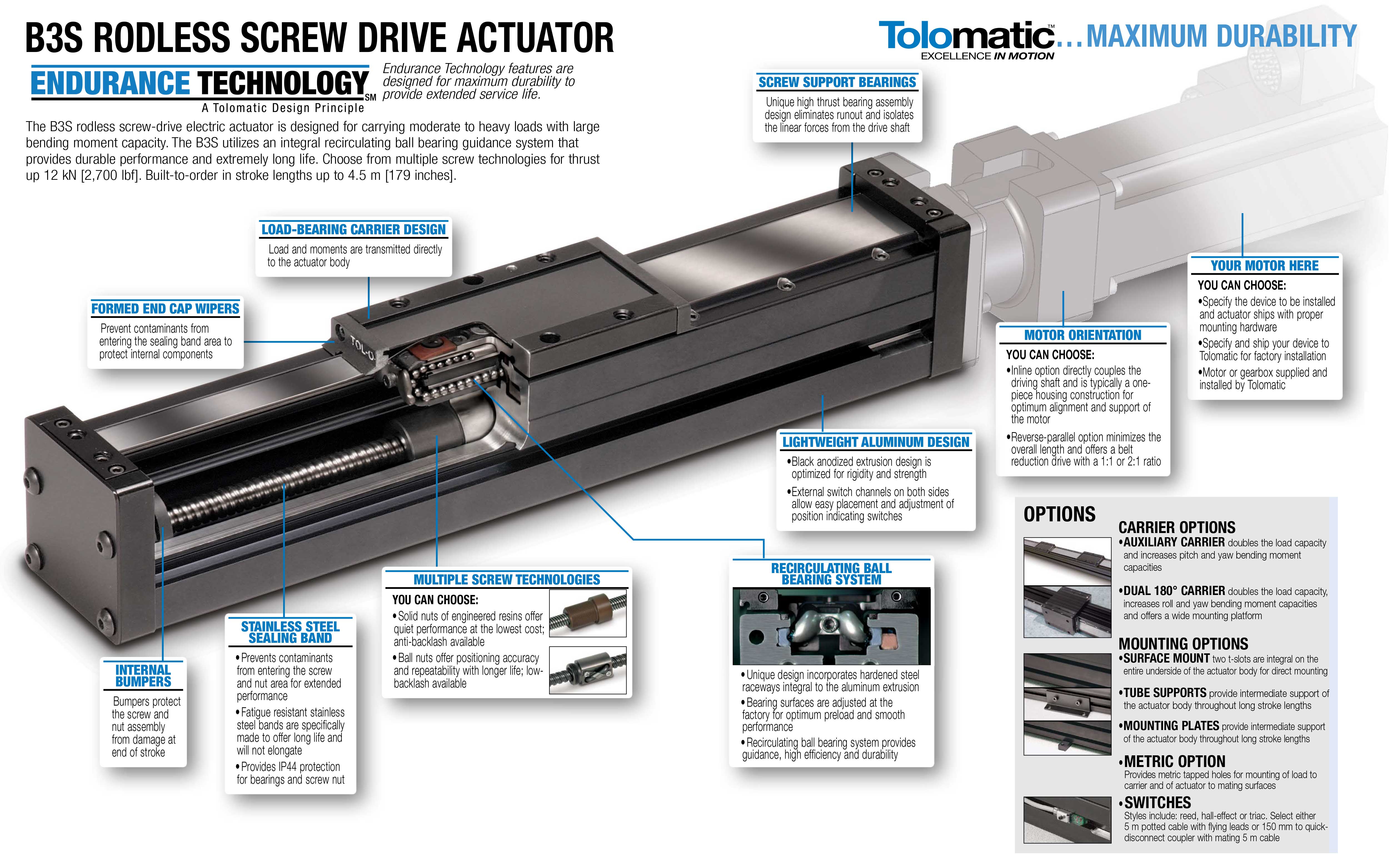 Der B3S Kugelgewinde- Linearantrieb ist in der Lage, bei gleichbleibender Laufruhe hohen Lasten und Biegemomenten standzuhalten. Die B3S Kugelgewinde-Linearantriebe verfügen über geschlossene  Kugelumlaufführungen , wodurch die Verwendung einer externen  Lastführung überflüssig wird. Der B3S Kugelgewinde-Linearantrieb bietet eine hohe Wiederholgenauigkeit und einen Arbeitszyklus von 100 % mit langer Lebensdauer.