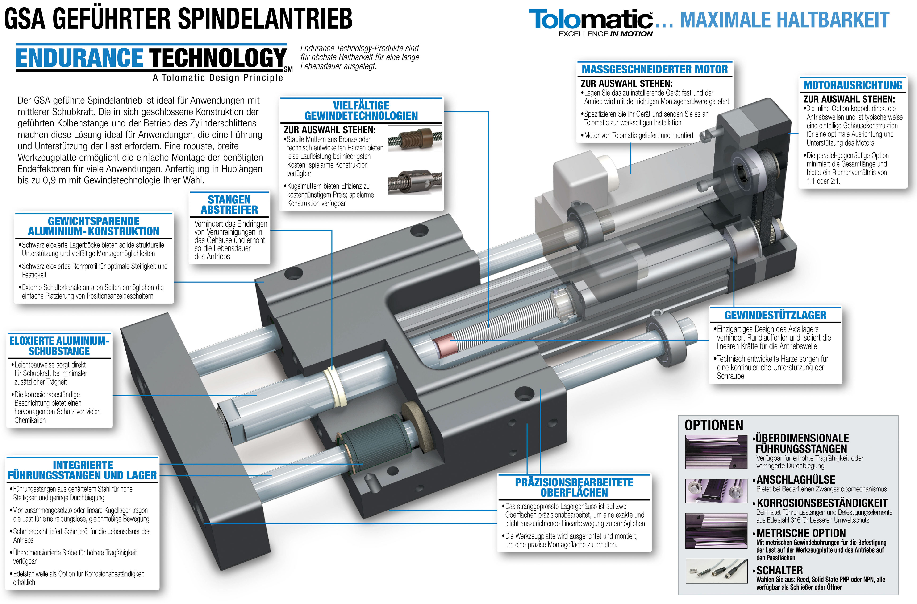 Lineare GSA Schieberantriebe  kombinieren einen elektrischen Stangenantrieb mit Führungsstangen, Montageblöcken und Lagern. Es steht eine komplette Auswahl an Baugrößen, Optionen und Systemkomponenten zur Verfügung. Der lineare GSA Schieberantrieb bietet hohe Leistung, Zuverlässigkeit und Montageflexibilität für zentrale Anwendungen.