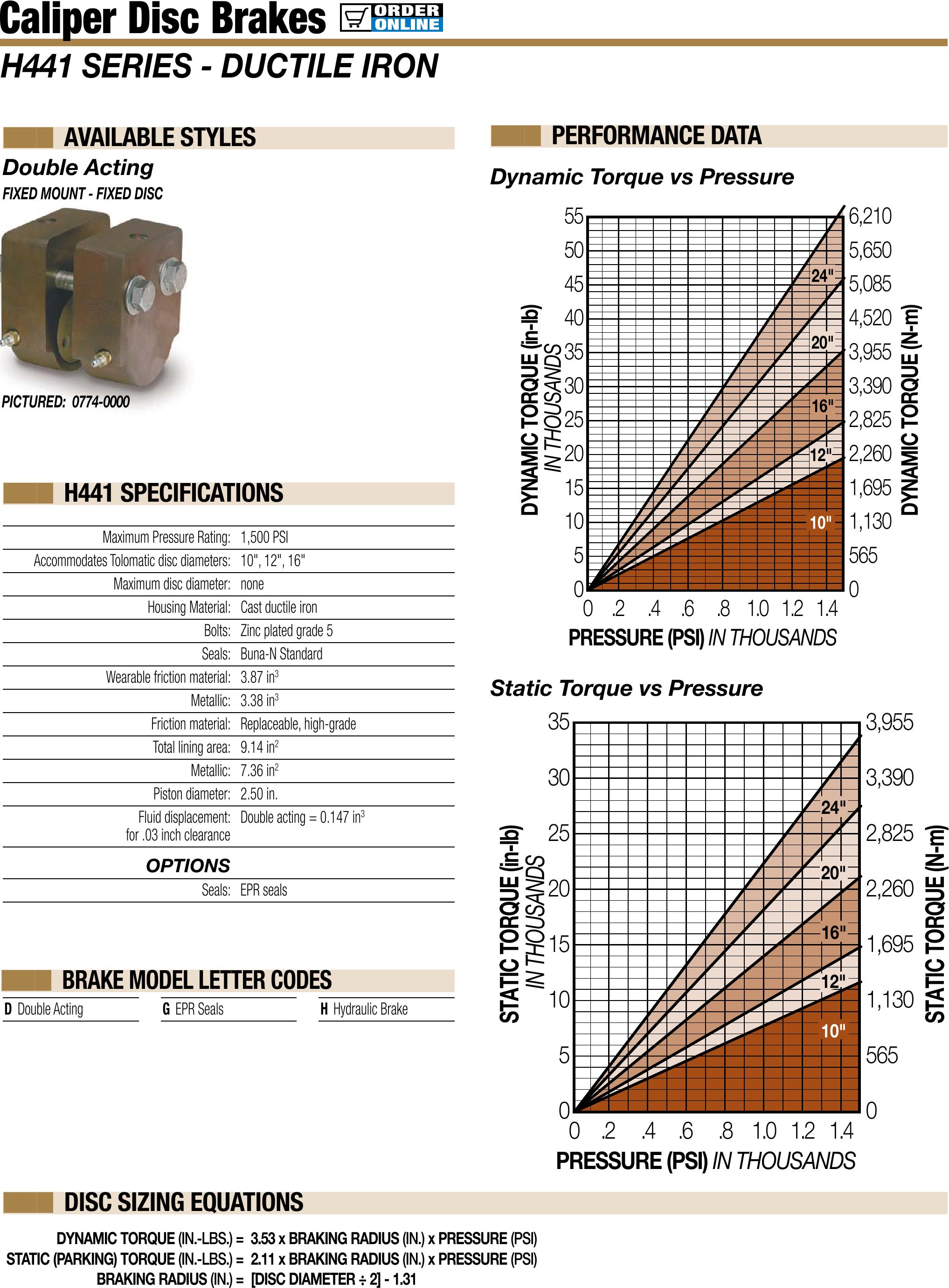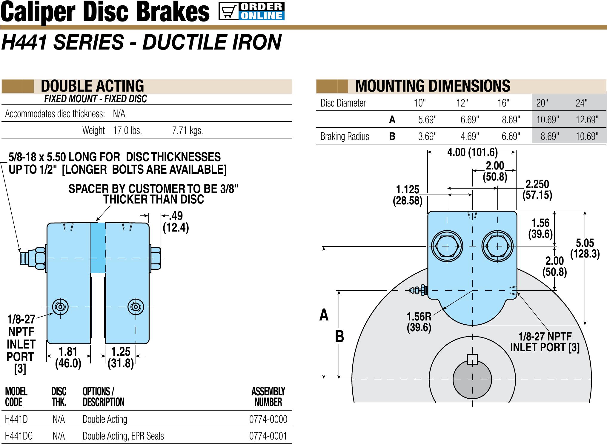 Die hydraulischen Scheibenbremsen der Serie H441 aus duktilem Eisen bieten ein Drehmoment von bis zu 3955 Nm (35.000 in-lb) bei einem maximalen Druck von 68,95 bar (1000 PSI). Die Serie H441 von hydraulischen Scheibenbremsen aus duktilem Eisen umfasst einfach- und doppeltwirkende Modelle.