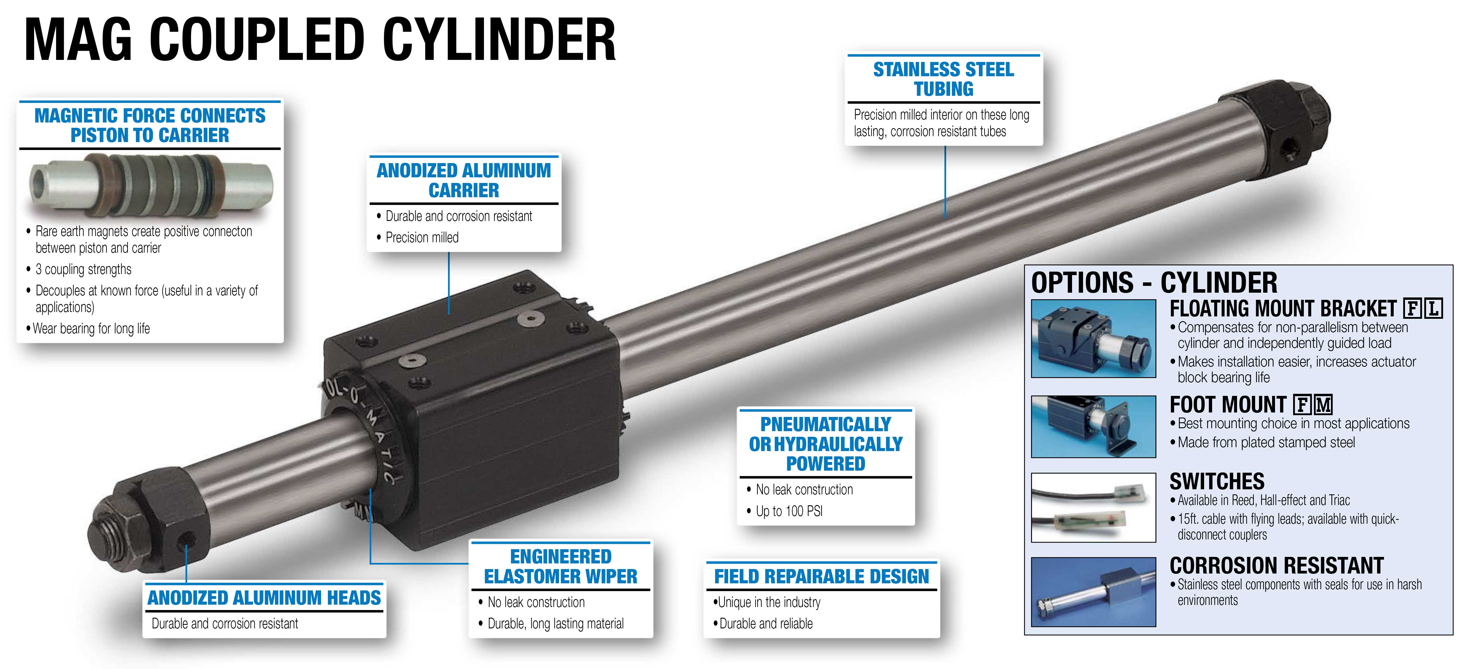 Der magnetische MG Linearzylinder hat keine mechanische Verbindung des Trägers mit dem Kolben, was eine leichte Drehung des Befestigungsblocks und somit eine flexible Montage ermöglicht.