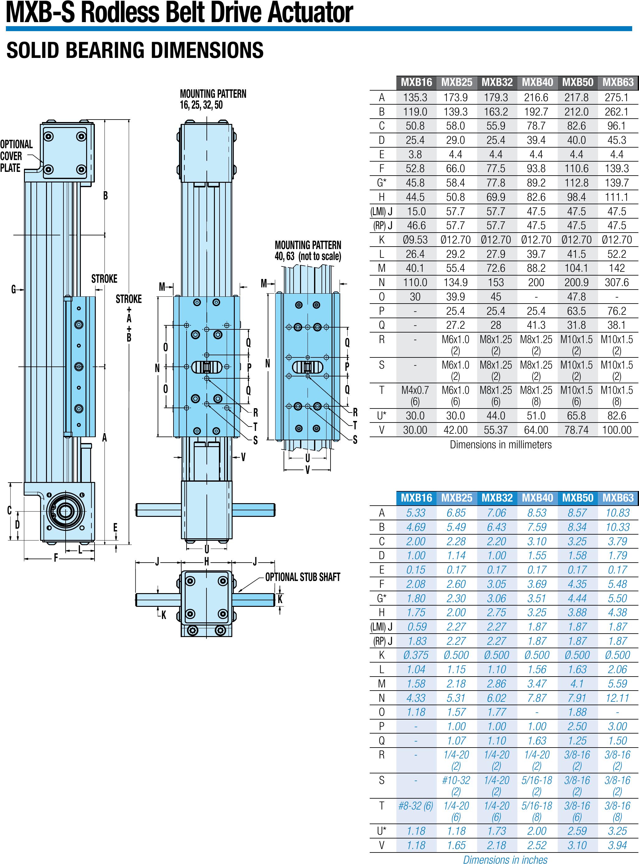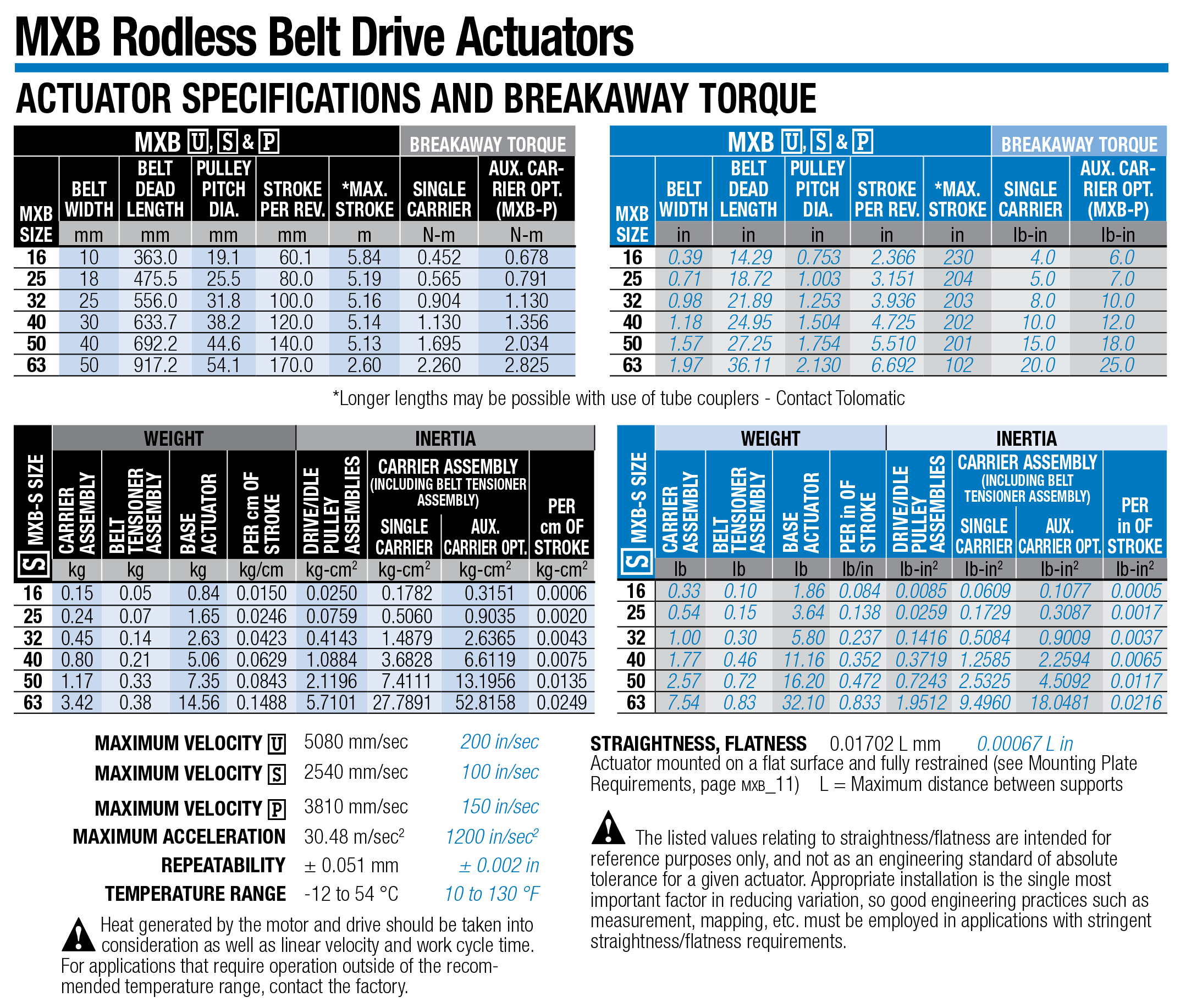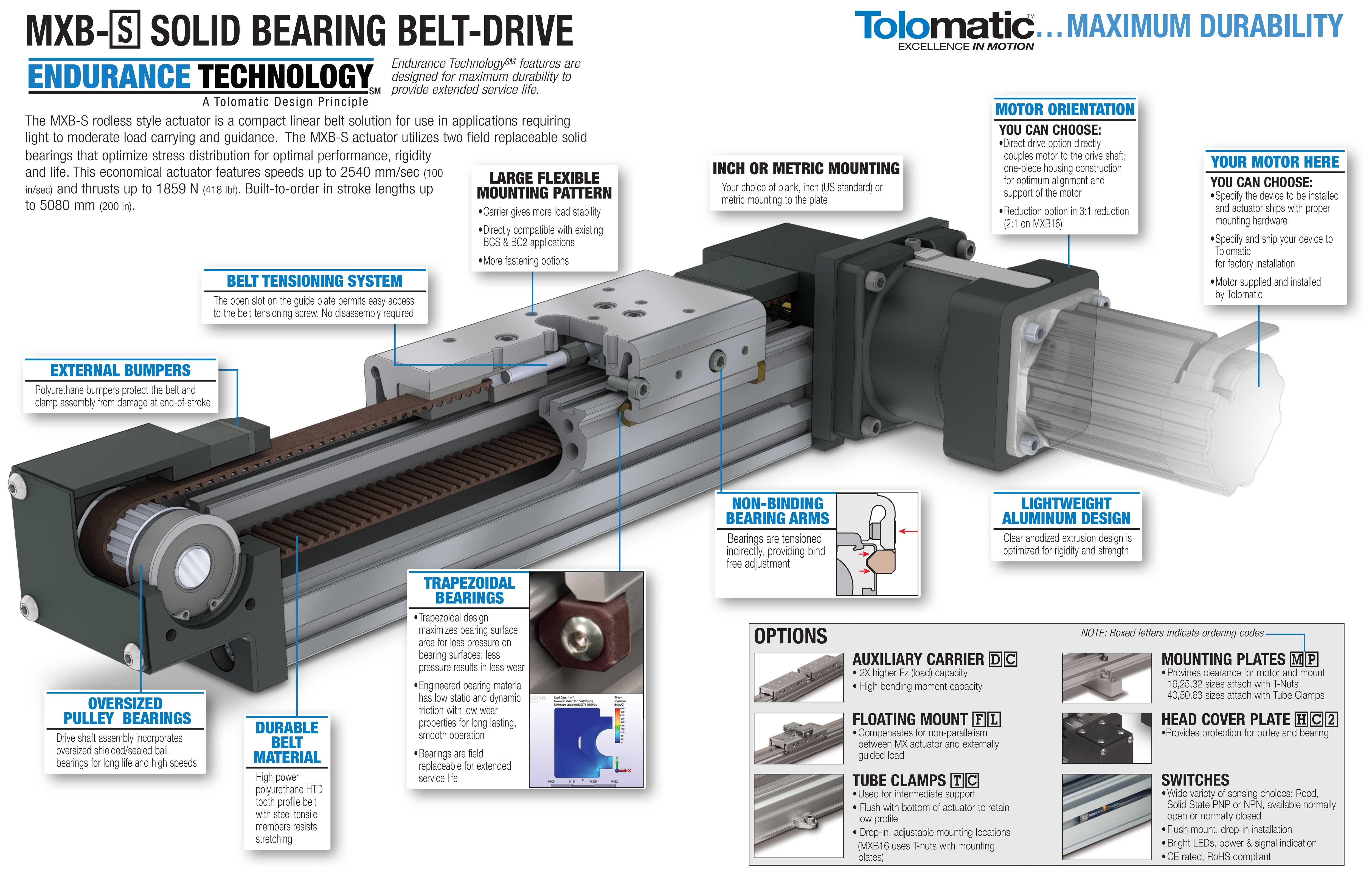 Der MXB-S ist ein kompakter linearer Riemenantrieb für Anwendungen, die eine leichte bis mittelschwere Lastaufnahme und -führung erfordern. Das Lagersystem des linearen MXB-S Riemenantriebs verwendet zwei vor Ort austauschbare Festlager, die Leistung und Lebensdauer optimieren. Der lineare MXB-S Riemenantrieb ist mit einem trapezförmigen, selbstreinigenden Lagersystem ausgestattet und somit eine gute Wahl für Anwendungen in der Papierherstellung oder in Sägewerken. Dieser preisgünstige und wirtschaftliche Riemenantrieb bietet eine Geschwindigkeit von bis zu 2540 mm/sec (100 in/sec) und eine Schubkraft von bis zu 1860 N (418 lbf). Alle linearen MXB-S Riemenantriebe sind mit individuellen Hublängen bis 5080 mm (200 Zoll) erhältlich.