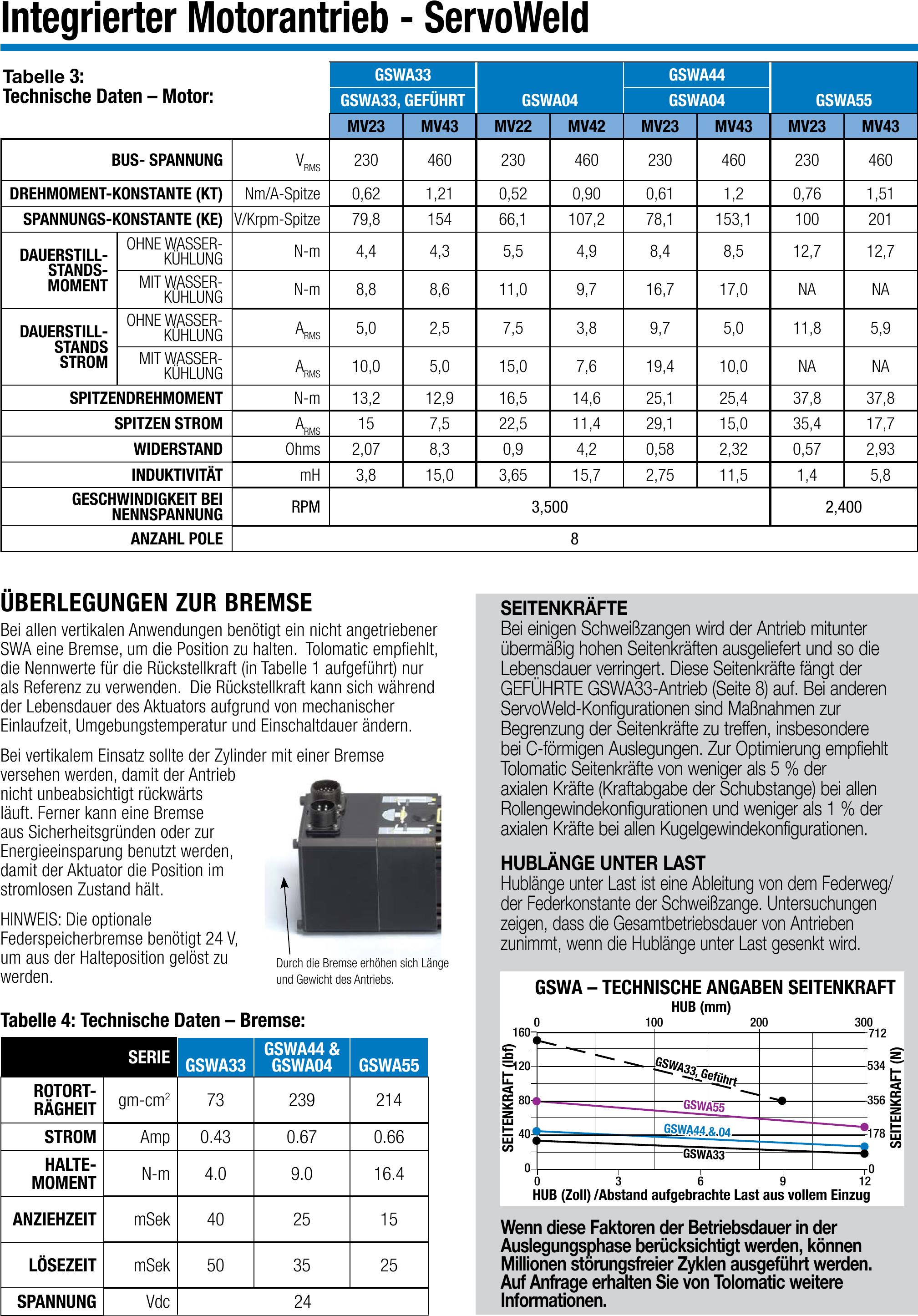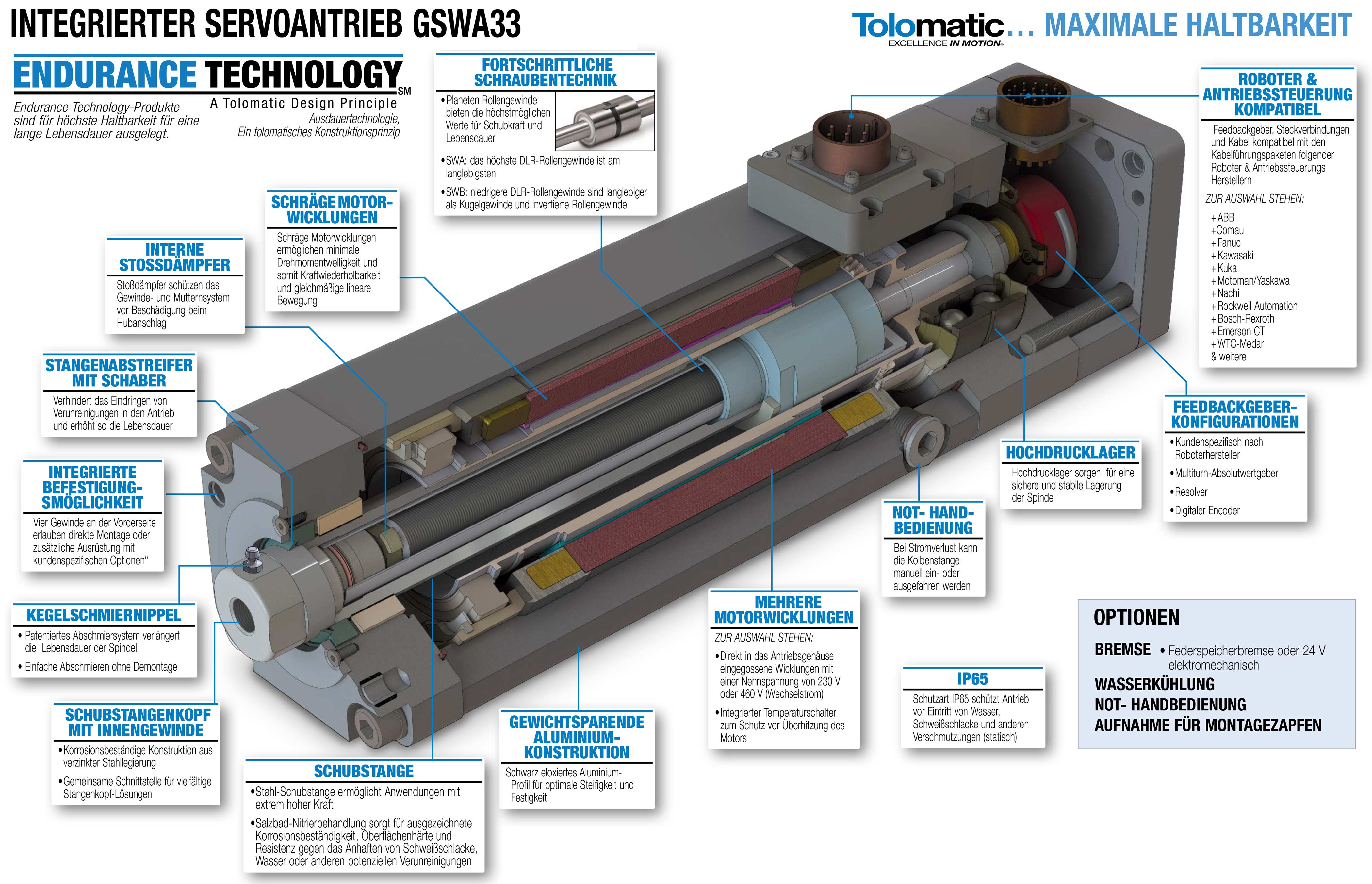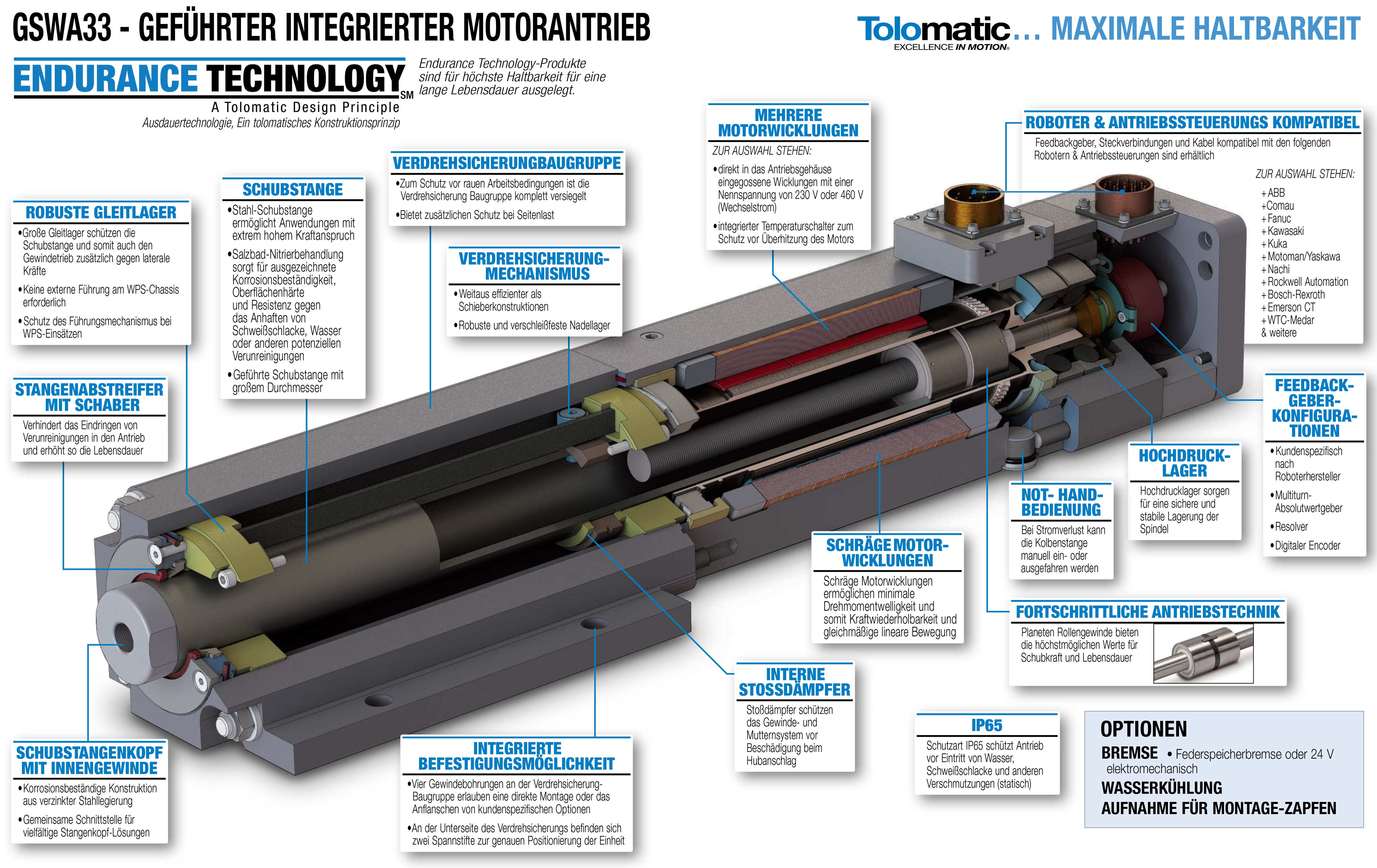 Der ServoWeld-Antrieb der Serie GSWA33 bietet eine Spitzenschubkraft von 9,3 kN (2.100 lbf) bei weniger Gewicht und ermöglicht so schnellere Roboterbewegungen und schnellere Schweißabläufe. Der GSWA33 kann für eine Vielzahl von Widerstandspunktschweißzangenanwendungen (X-, P- oder C-Schweisszangen) verwendet werden, einschließlich Schweißzangen, bei denen der Antrieb eine Verdrehsicherung der Schubstange benötigt.