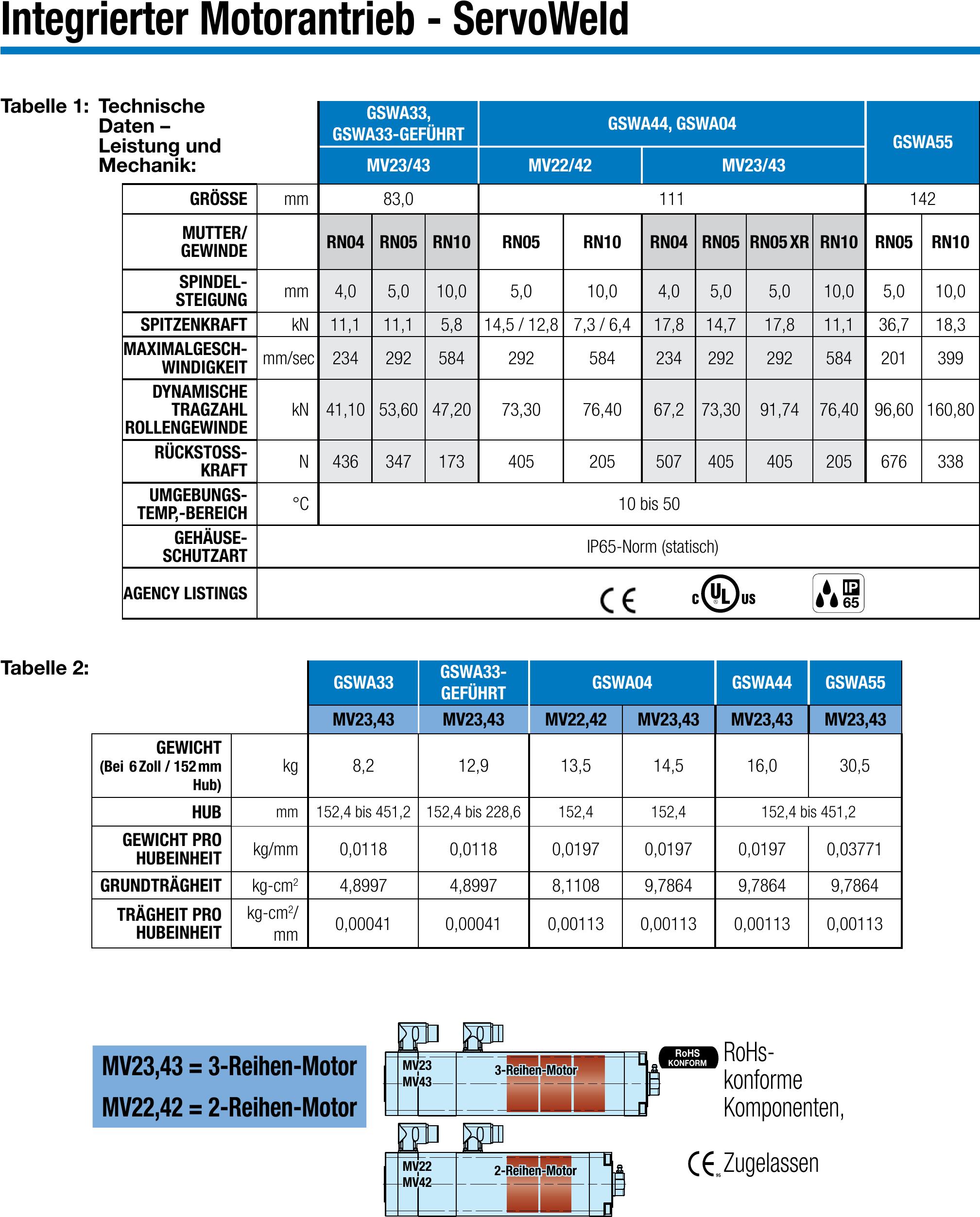 Ein eigens gefertigter Hochleistungs- Planetenrollengewindetrieb verleit GSWA33 Antrieben höchste Präzision und Lebensdauer. Dynamische Tragzahlen und Anzahl der erreichbaren Schweisspunkte liegen bei ServoWeld® Antrieben deutlich über den von vergleichbaren auf dem Markt erhältlichen Antrieben dieser Kraft- und Gewichtsklasse.
