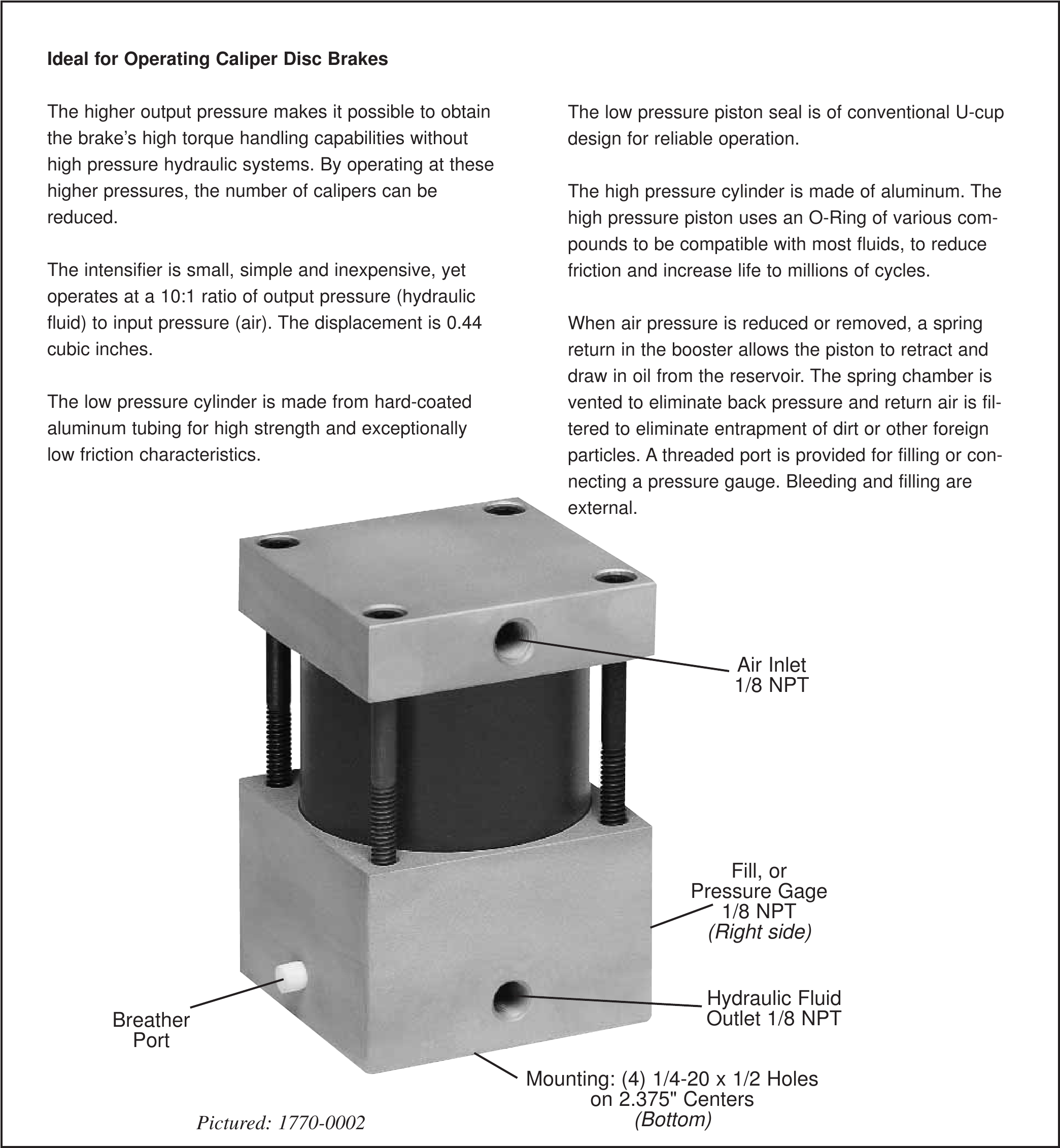 Der Verstärker von Tolomatic ist für den Einsatz mit allen hydraulischen Sattelscheibenbremsen ohne Federrückzug vorgesehen und erhöht den Ausgangsdruck, um die hohen Drehmomentkapazitäten der Bremse ohne den Einsatz von Hochdruck-Hydrauliksystemen zu erreichen.