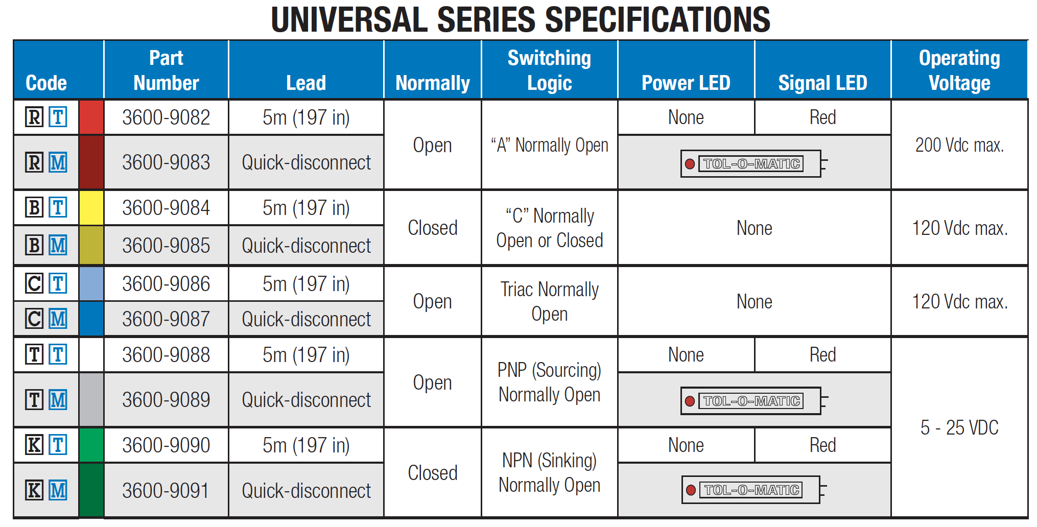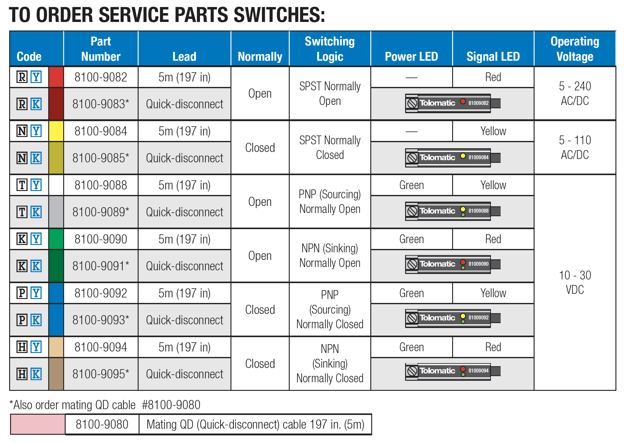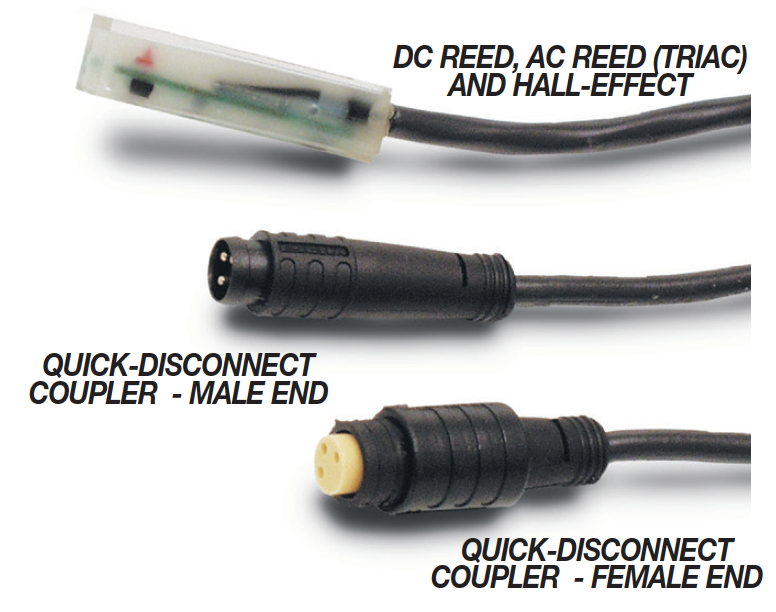 There are 10 sensing choices: DC reed, form A (open) or form C (open or closed); AC reed (Triac, open); Hall-effect, sourcing, PNP (open); Hall‑effect, sinking, NPN (open); each with either flying leads or QD (quick disconnect).