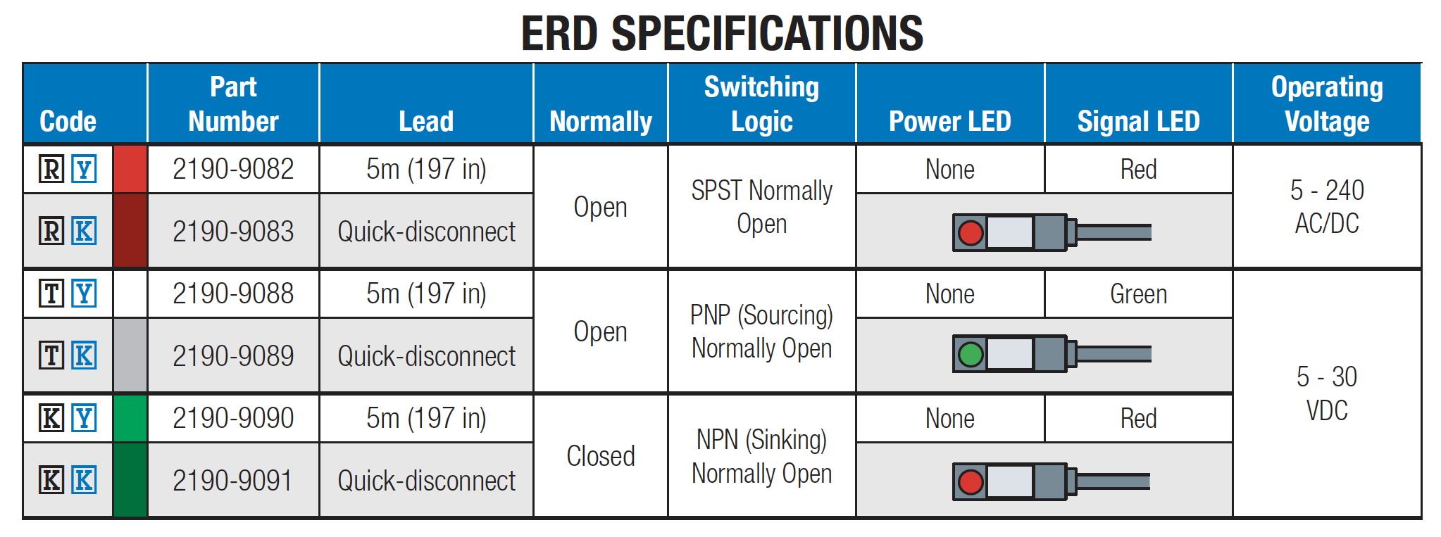 ERD actuators have 6 switch options: reed, solid state PNP (sourcing) or solid state NPN (sinking); normally open; with flying leads or quick-disconnect.