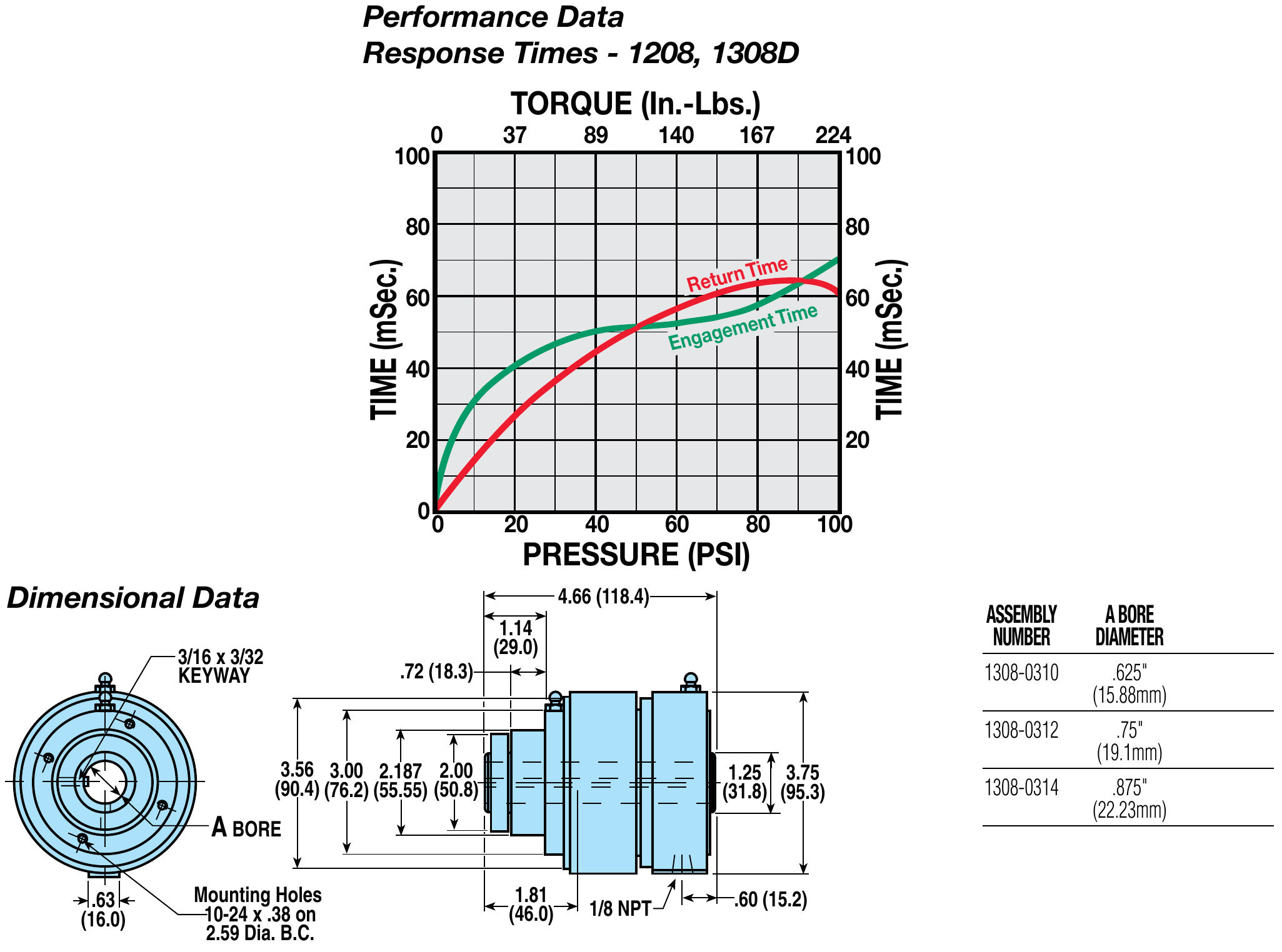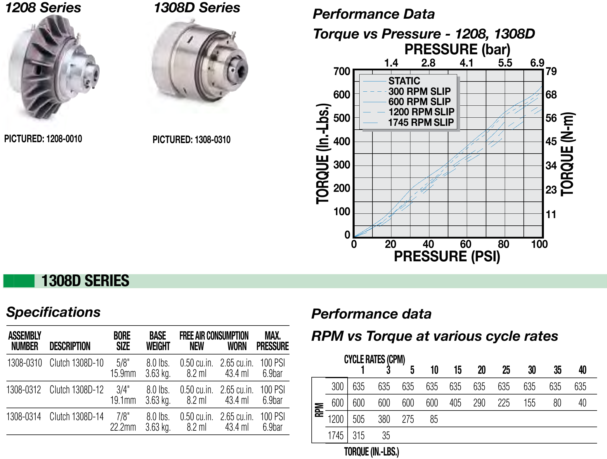The 1308D series pneumatic cone clutch has a space-saving design that offers torque ranges from 35 to 635 in-lbs (3.9 to 71.7 Nm) depending on cycle rate and RPMs.
