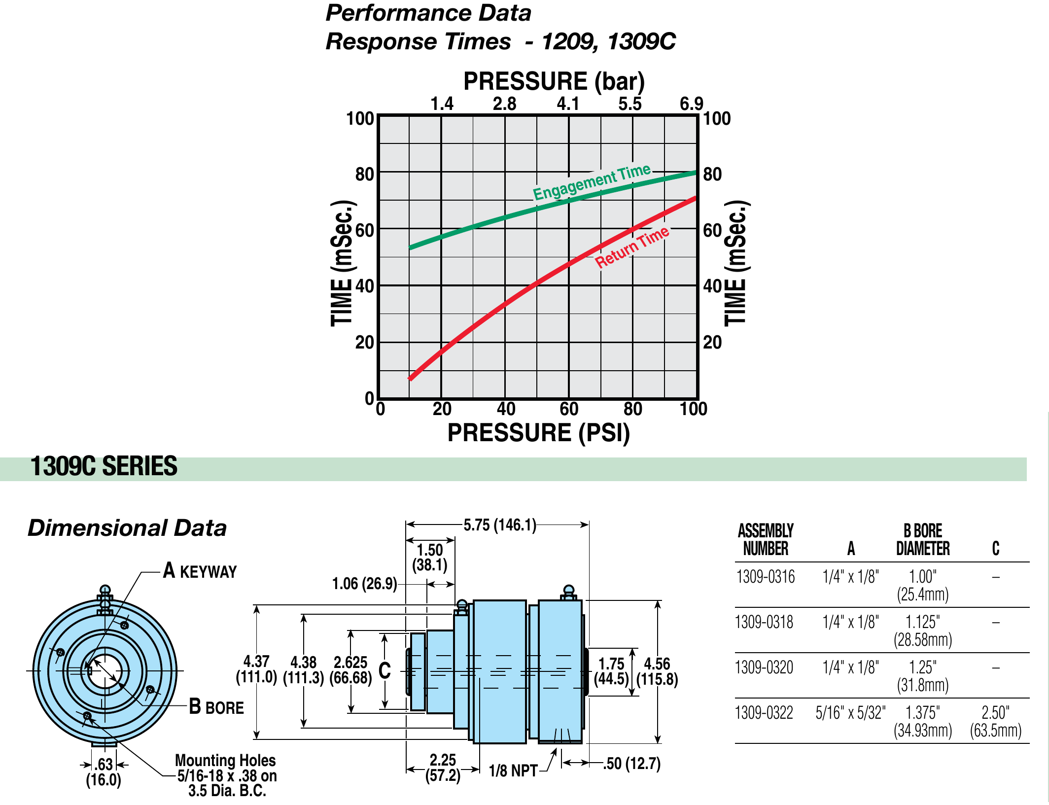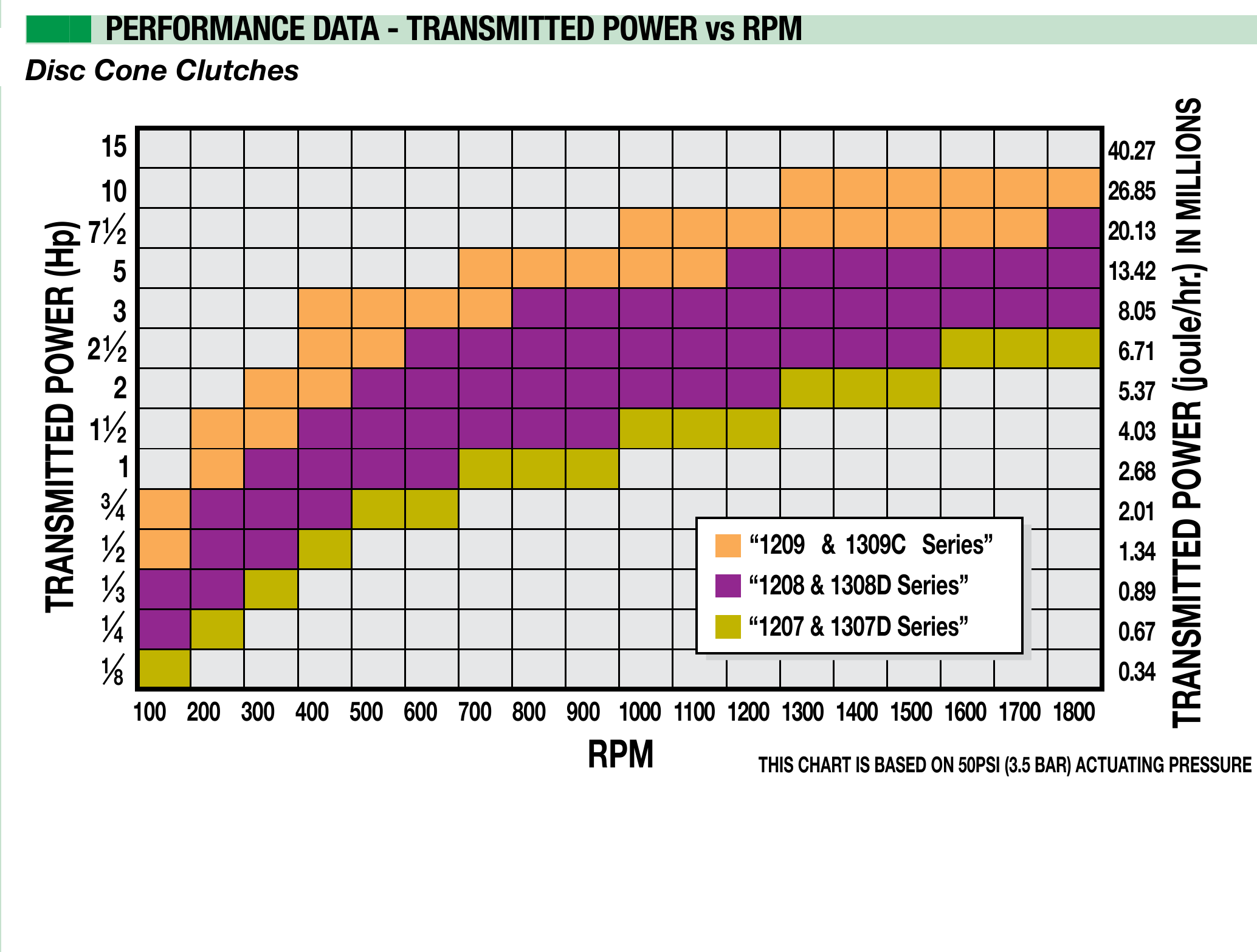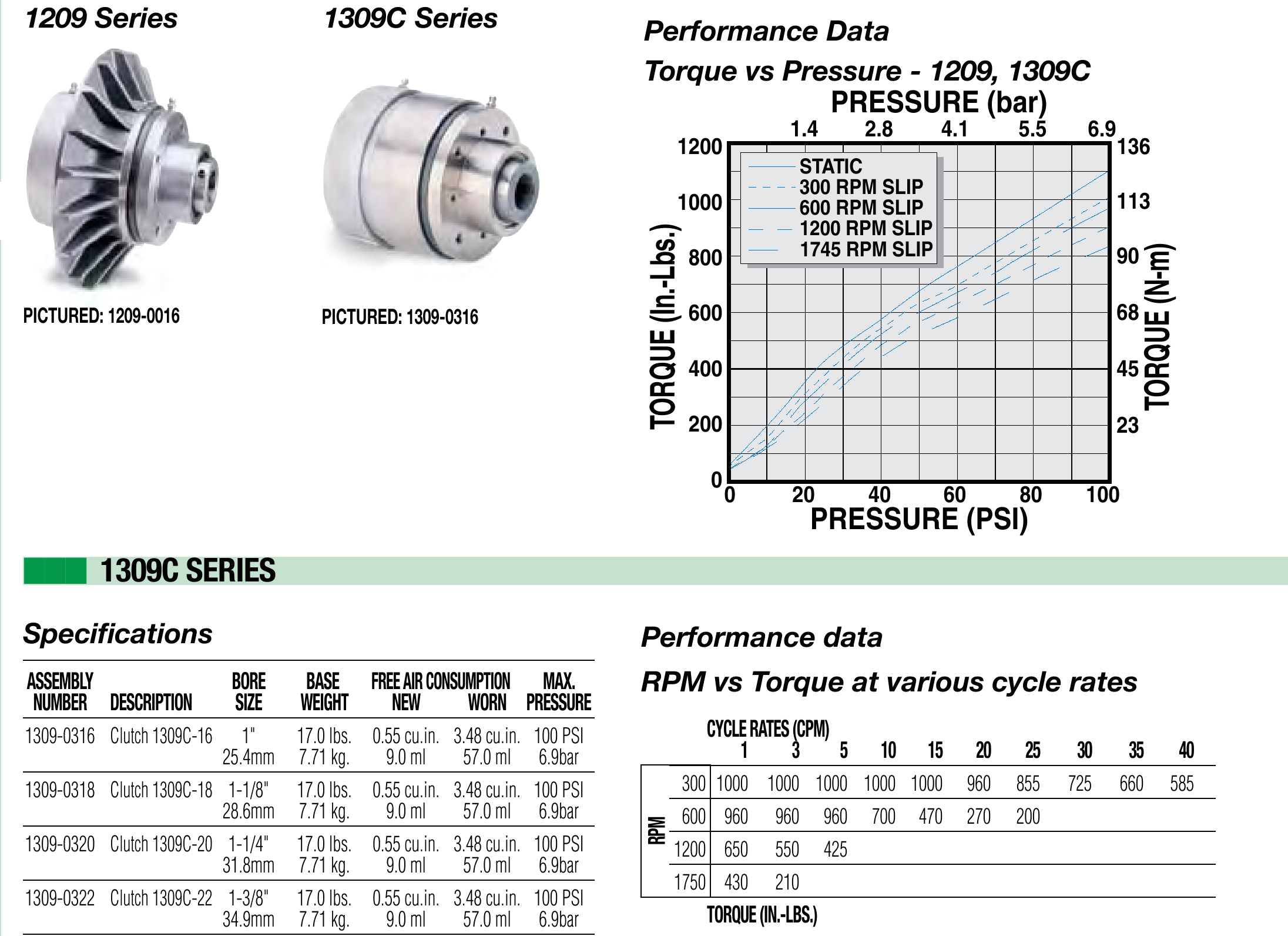 The 1309C series pneumatic cone clutch has a space-saving design that offers torque ranges from 210 to 1000 in-lbs (23.7 to 113 Nm) depending on cycle rate and RPMs.