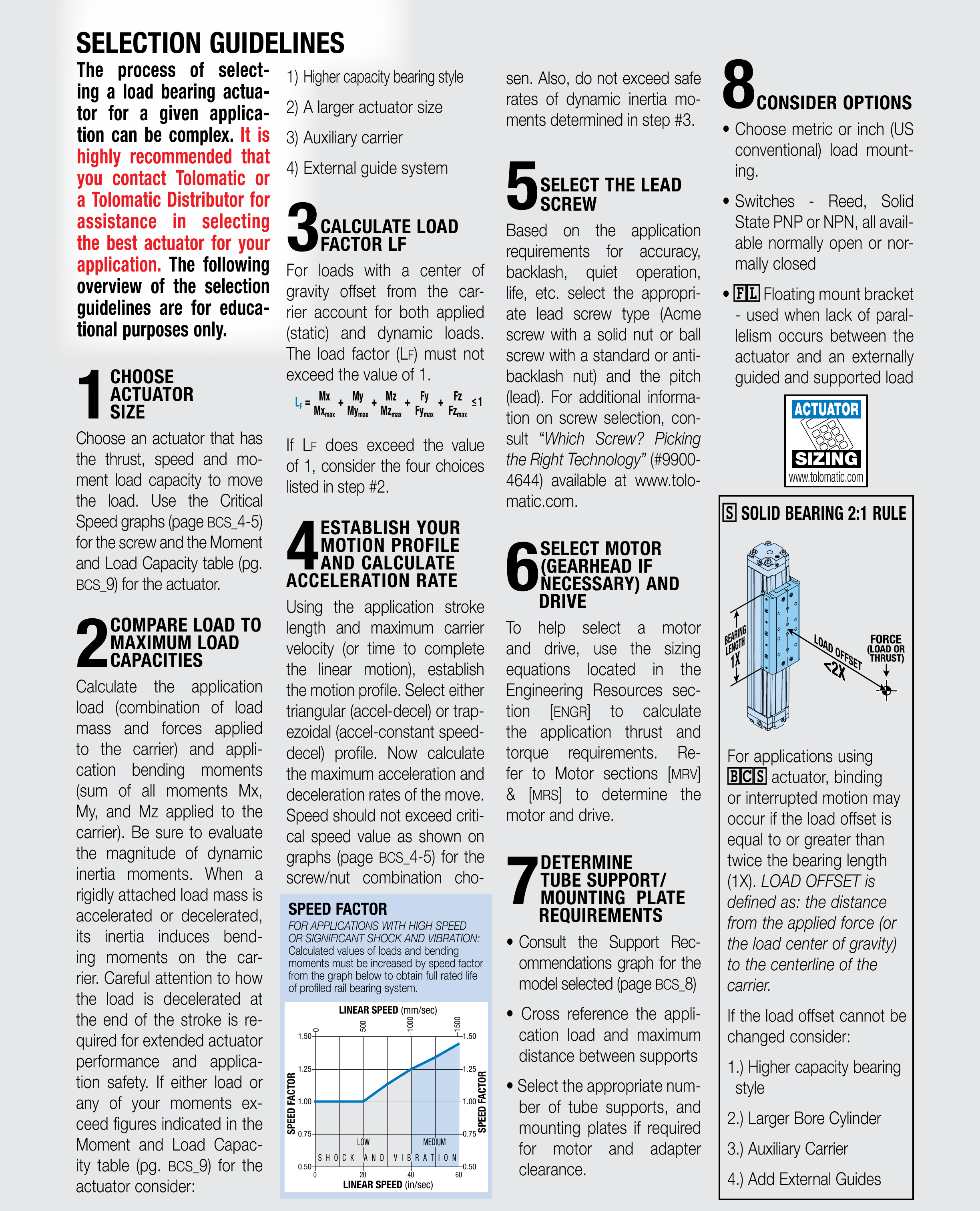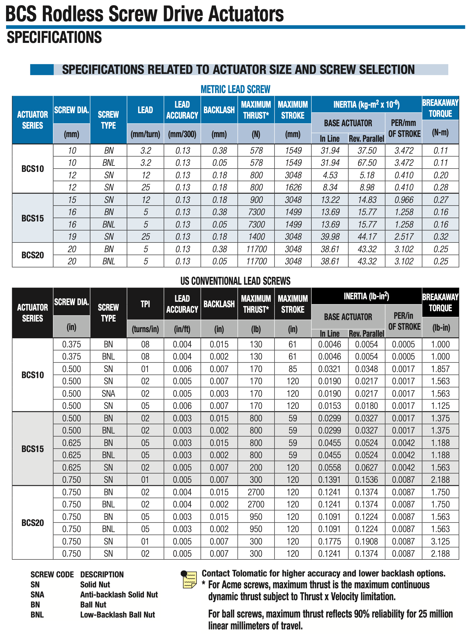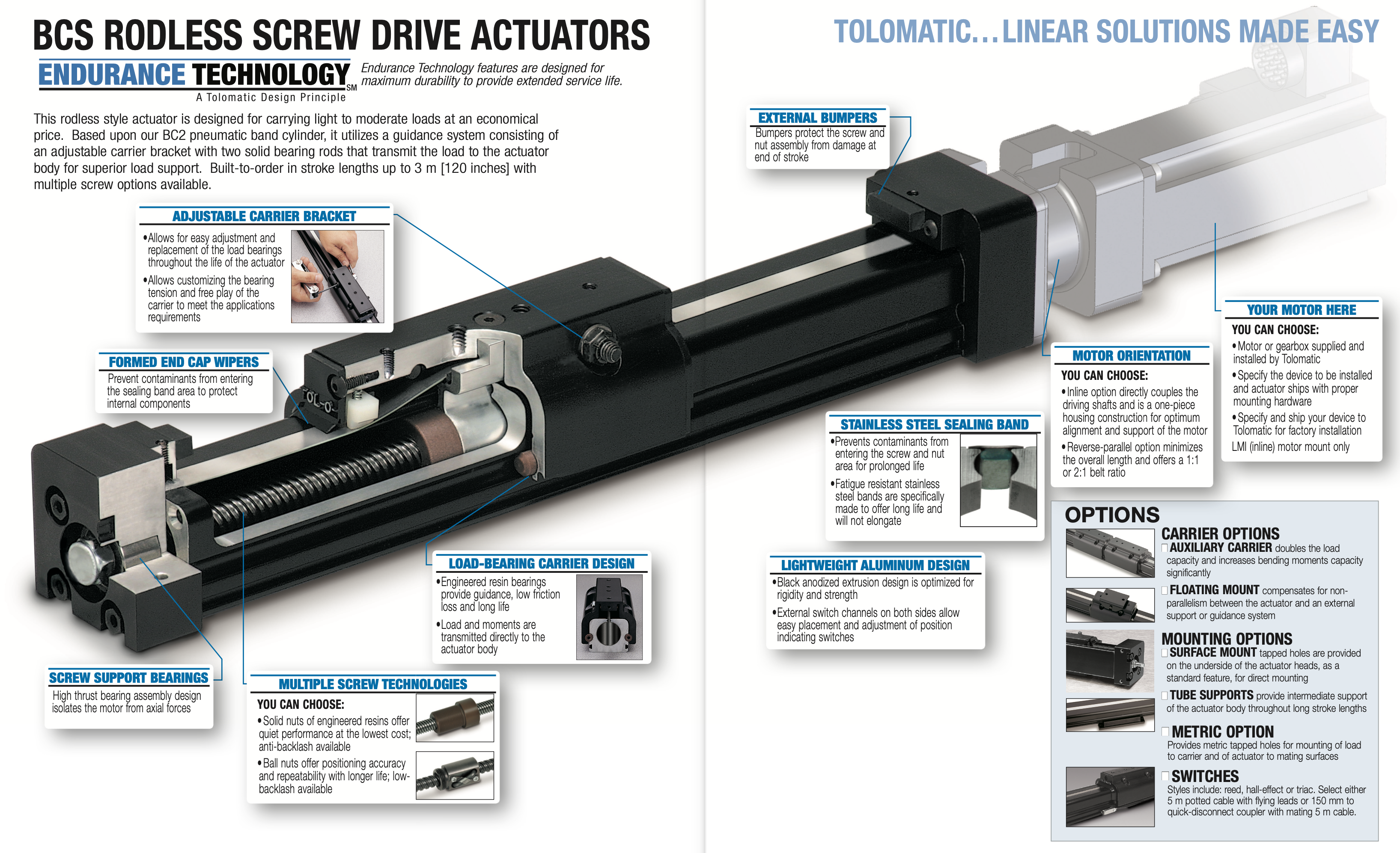 The BCS rodless screw actuator guidance system uses a patented adjustable carrier bracket that transmits the load to the cylinder body instead of the screw for good tracking, superior load support and controlled minimum friction load. The screw actuator's patented band retention system forms a tight metal-to-metal seal keeping contaminants out.