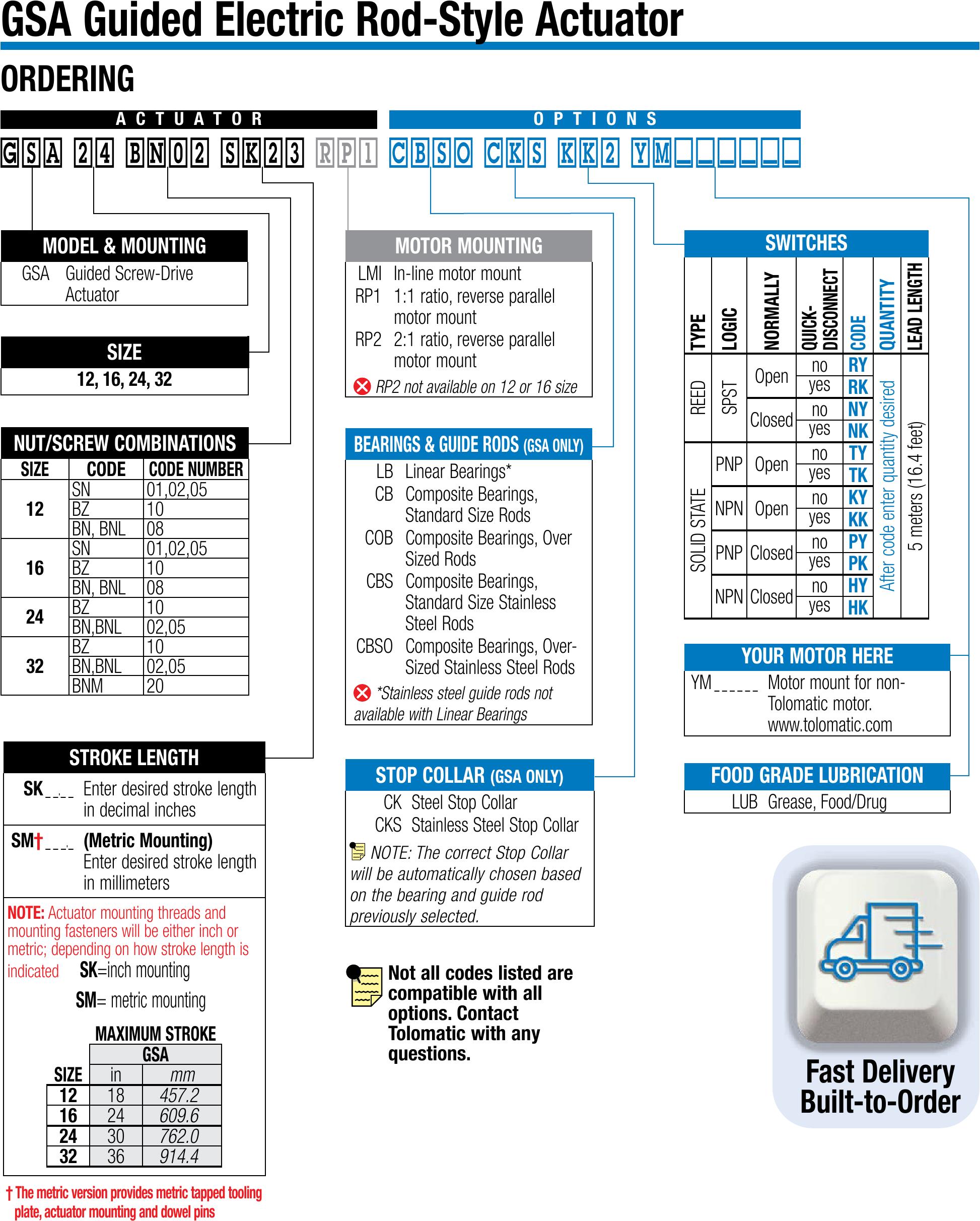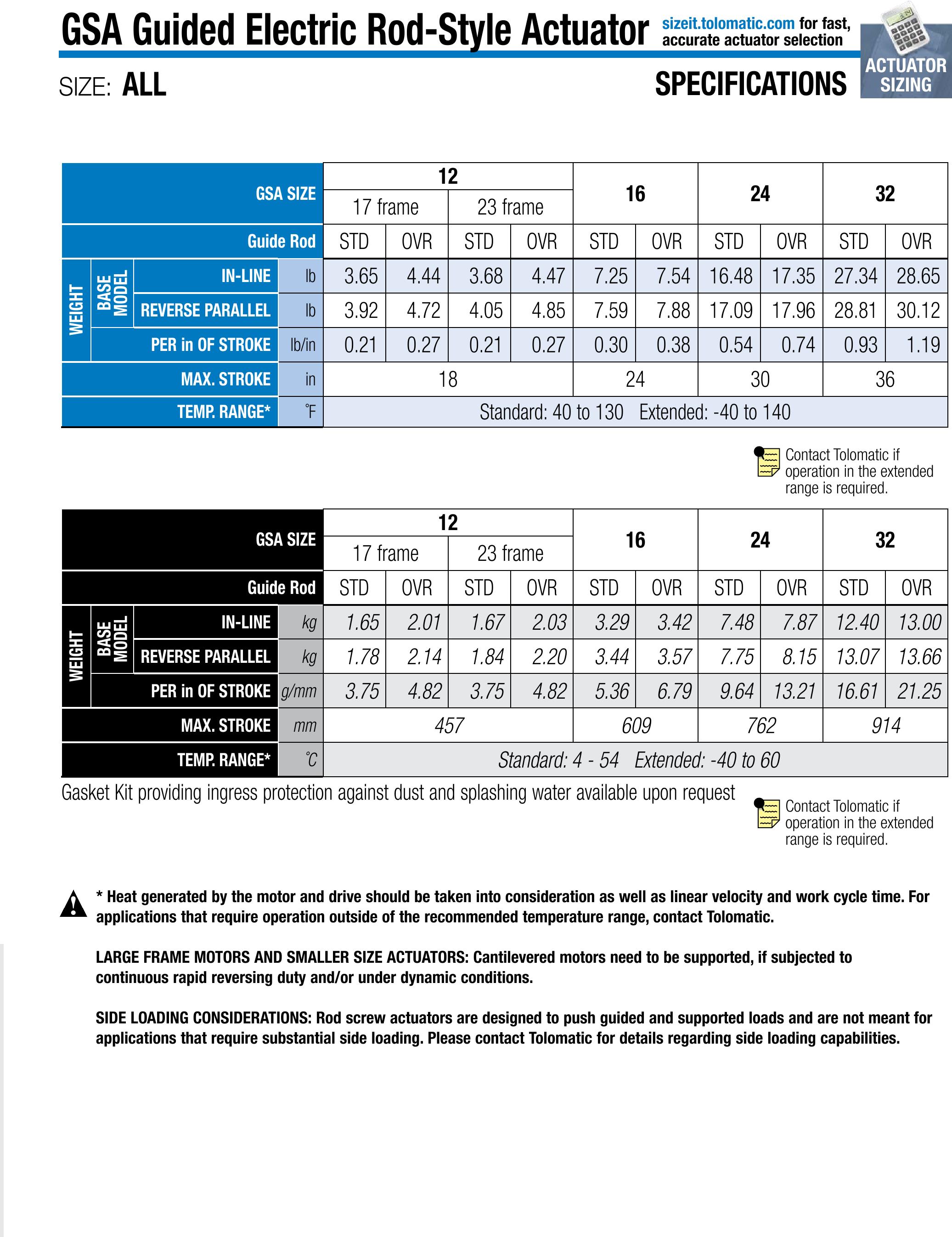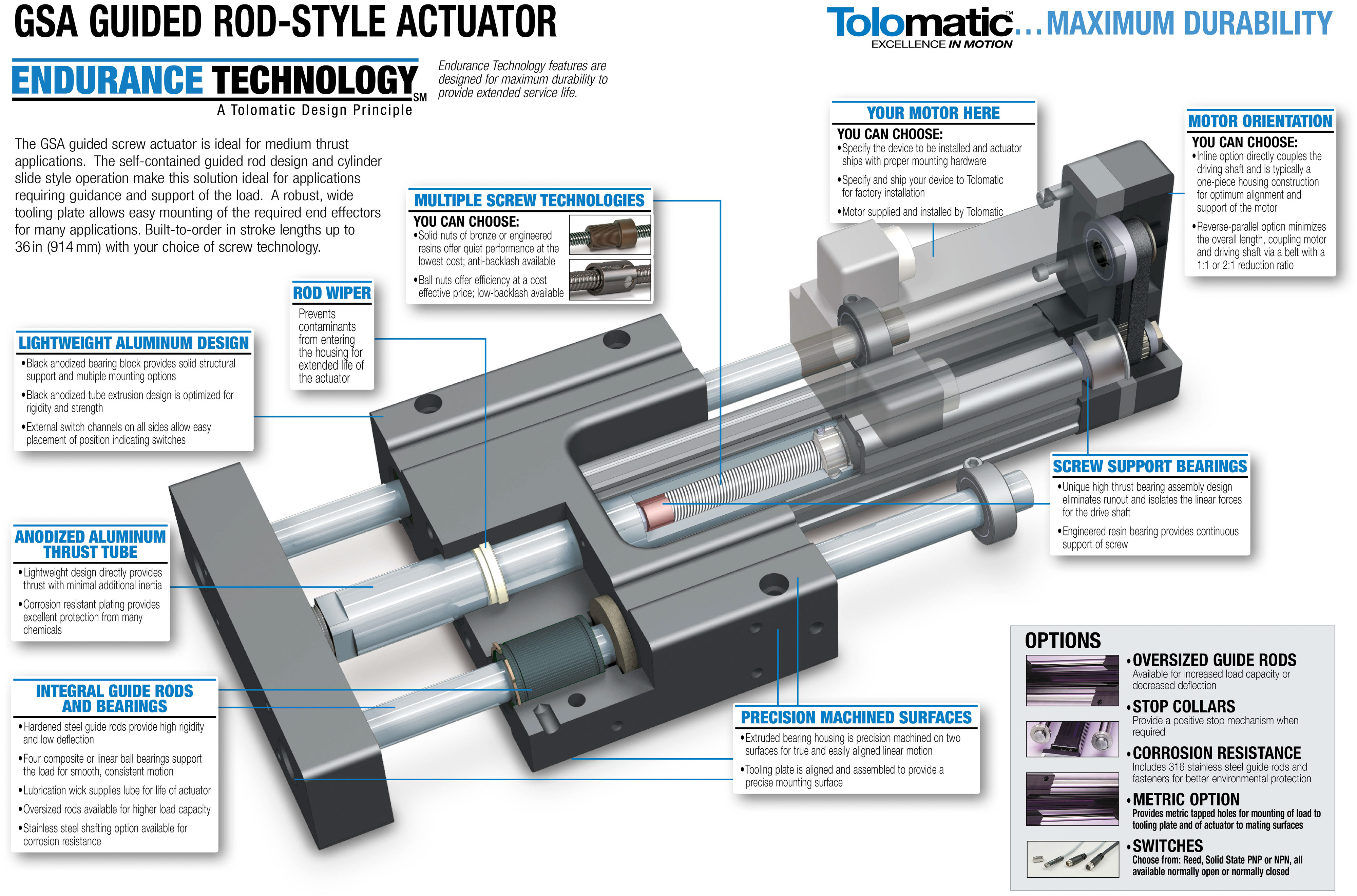 GSA Linear Slide Actuators combine an electric rod actuator with guide rods, mounting blocks and bearings. A complete selection of sizes, options and system components are available. The GSA Linear Slide Actuator offers high performance, dependability and mounting flexibility for pivotal applications.