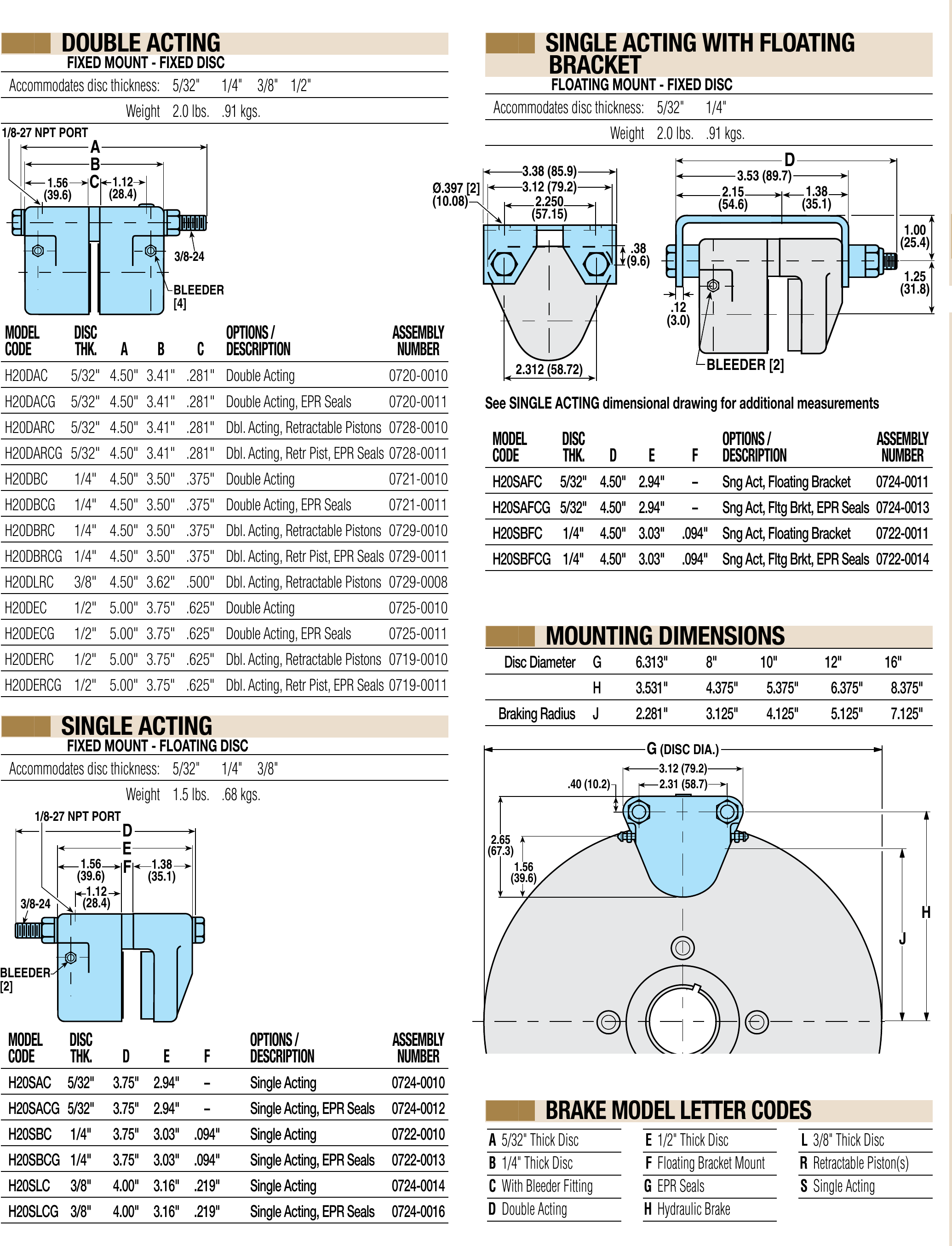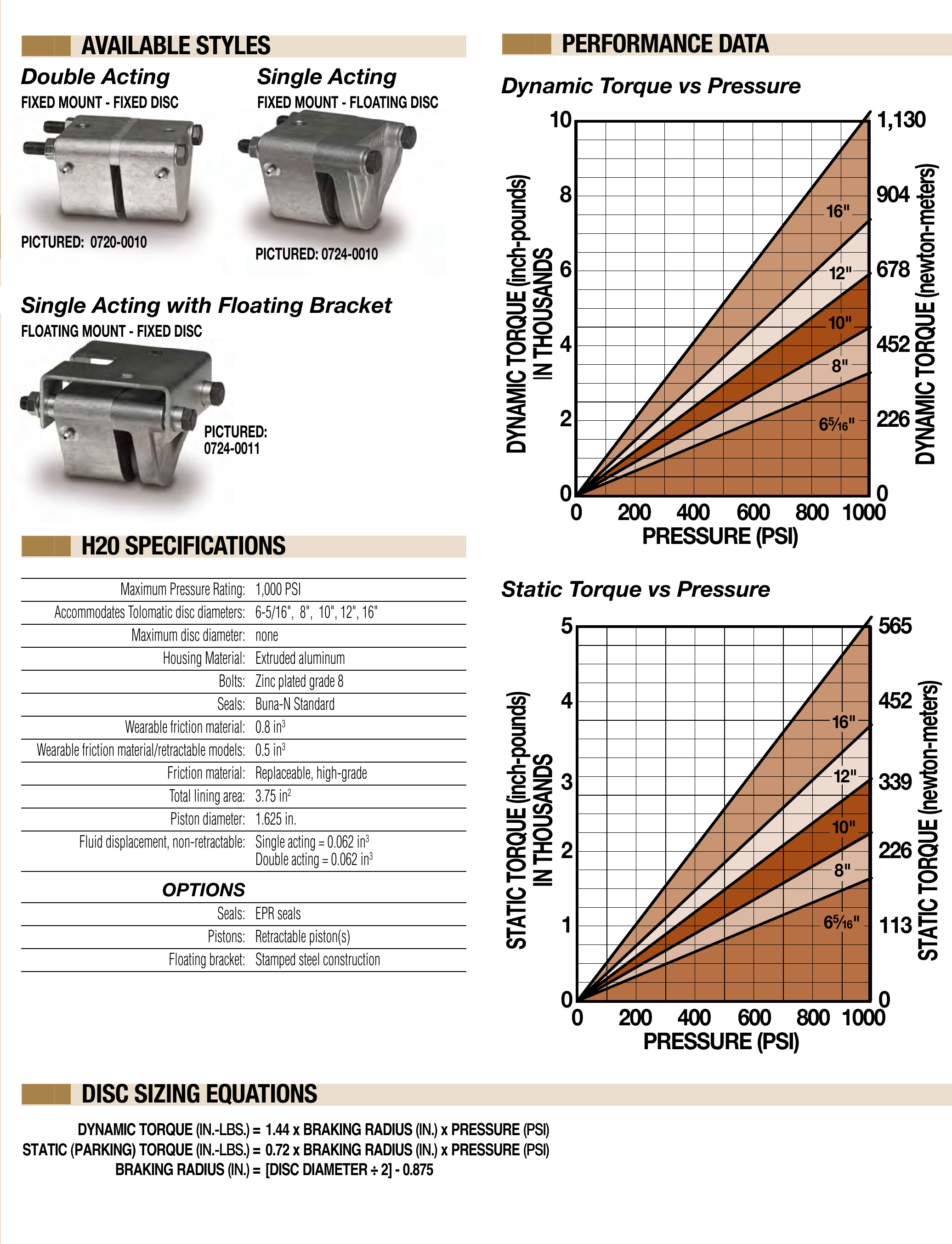 The H20 hydraulic disc brake series provides up to 10,000 in-lbs (1130 Nm) of torque at a maximum pressure of 1000 PSI (68.95 bar). The H20 hydraulic disc brake series offers single acting and double acting models.