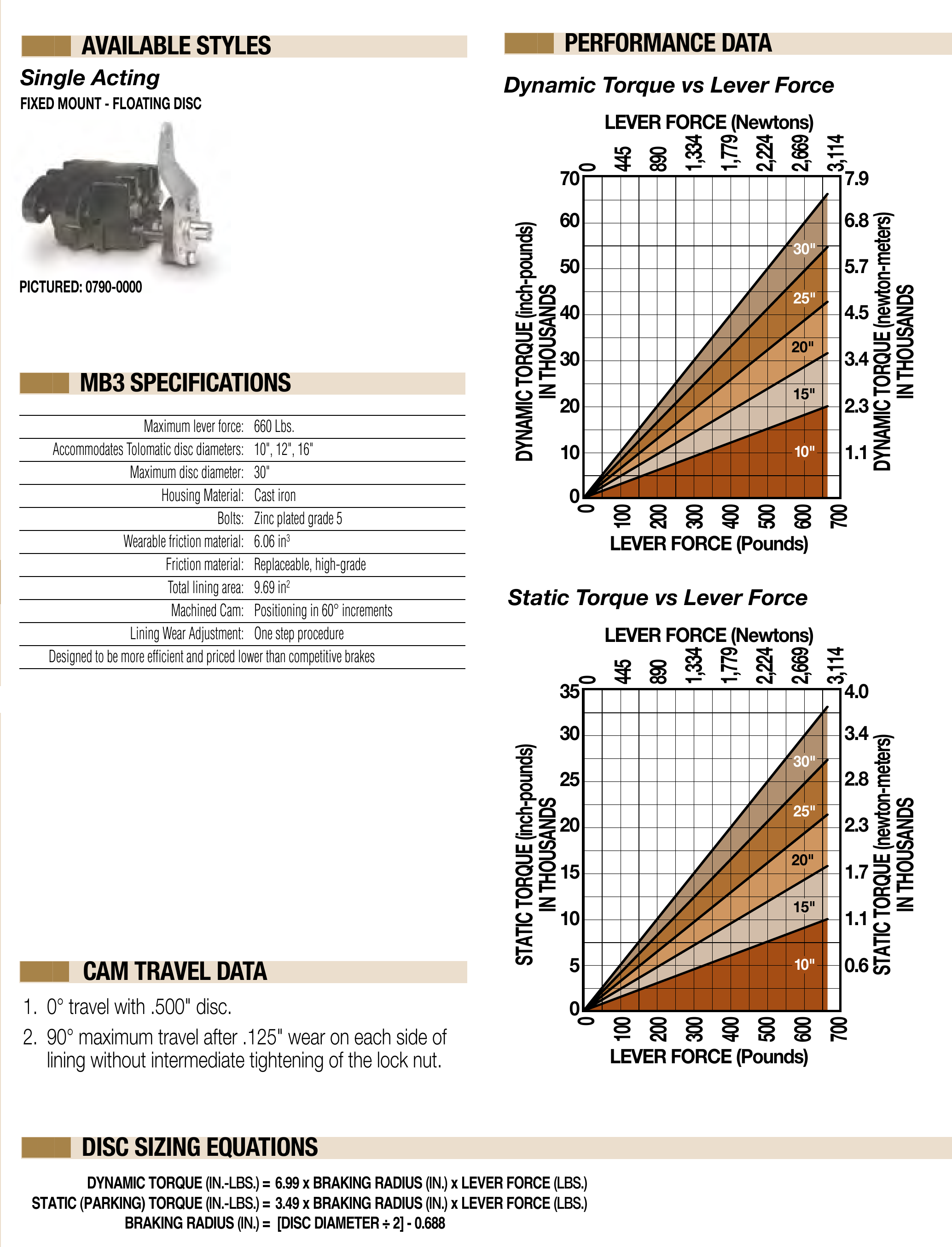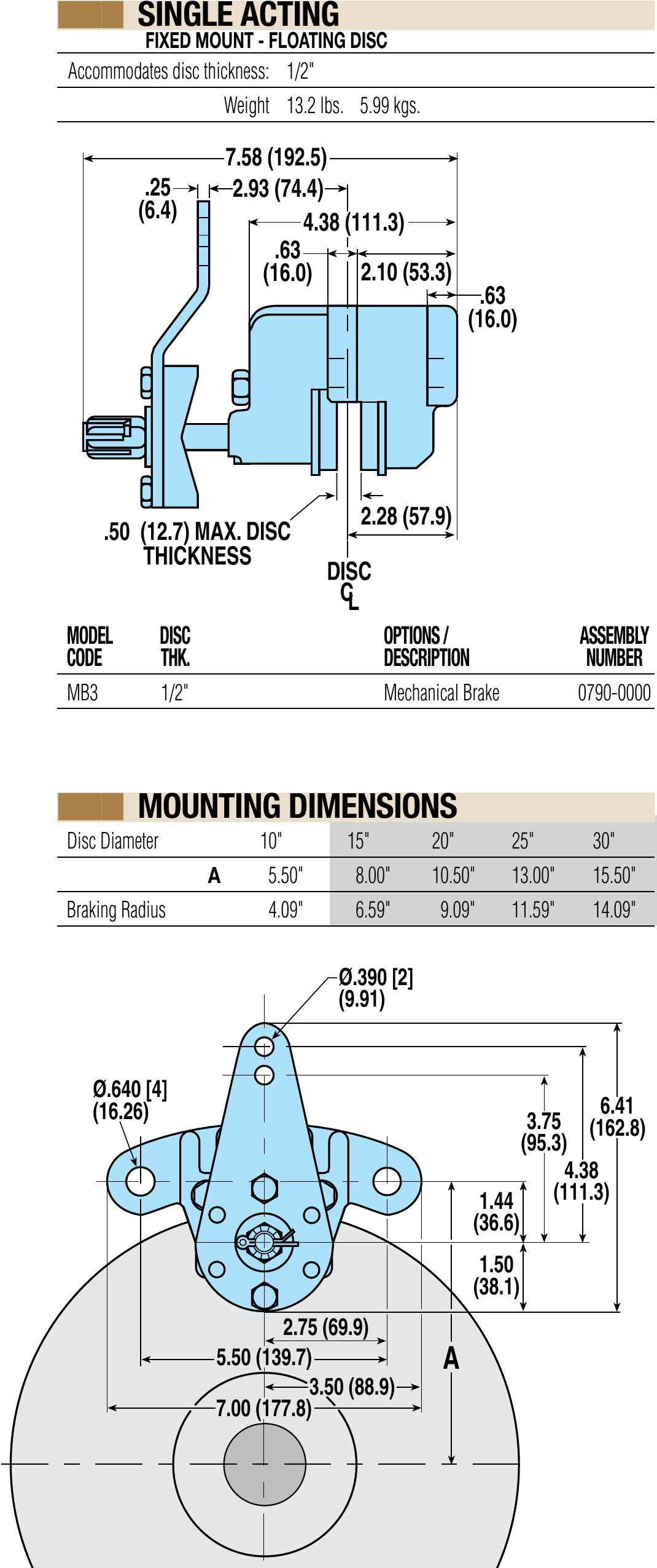 The MB3 mechanical disc brake series provides up to 33,700 in-lbs (3808 Nm) of torque. MB3 mechanical disc brakes are single acting and available in fixed mount and floating disc models.