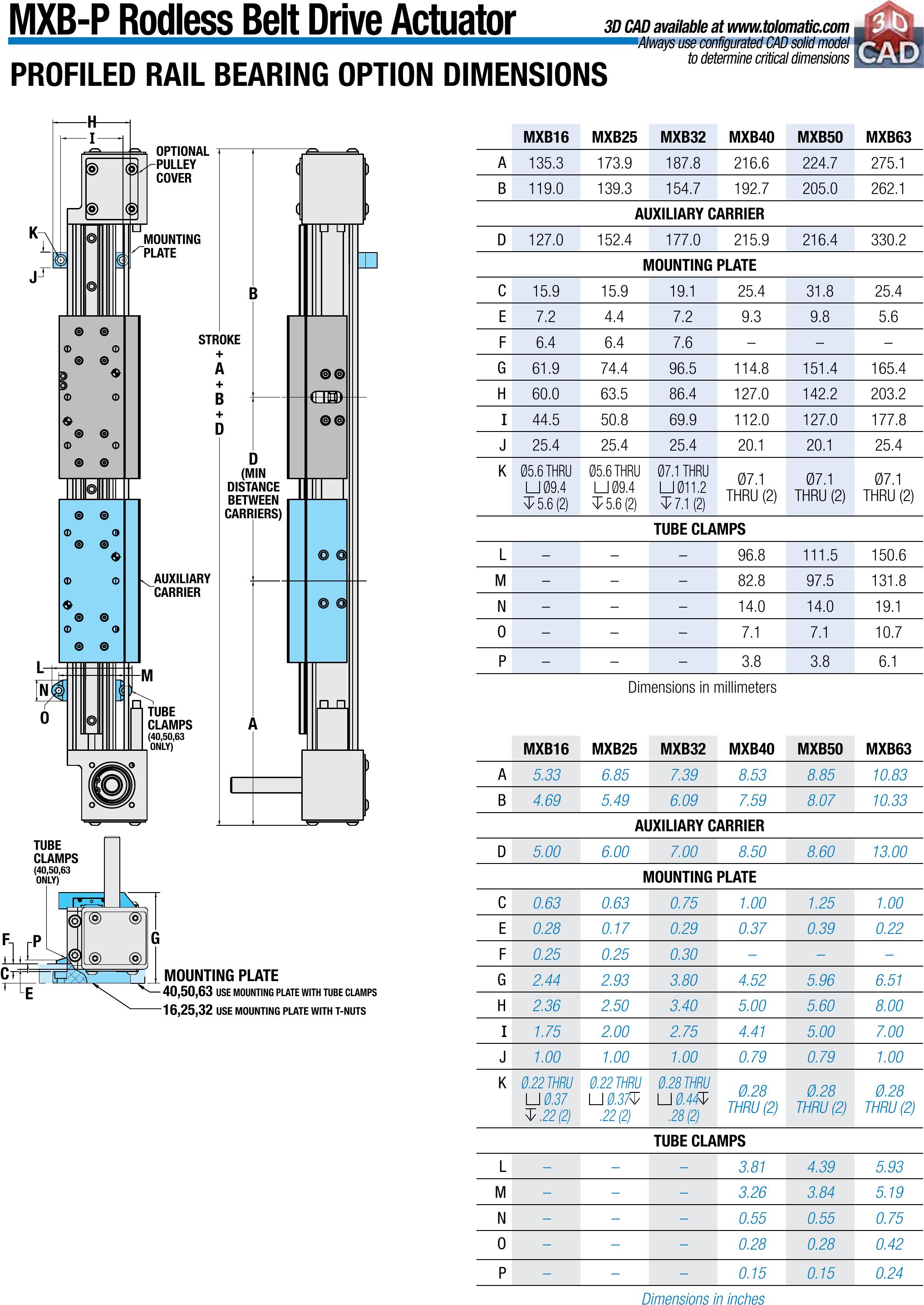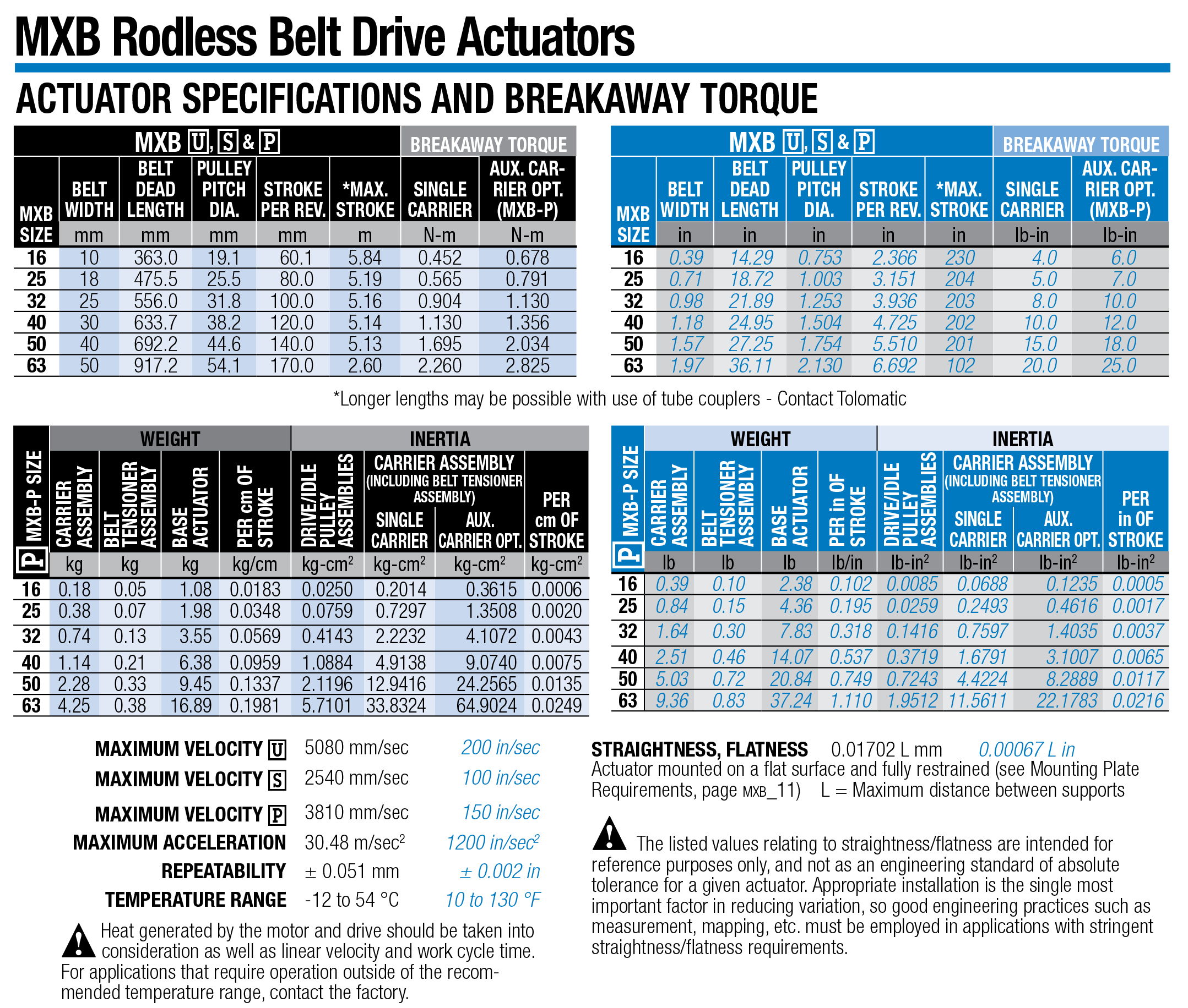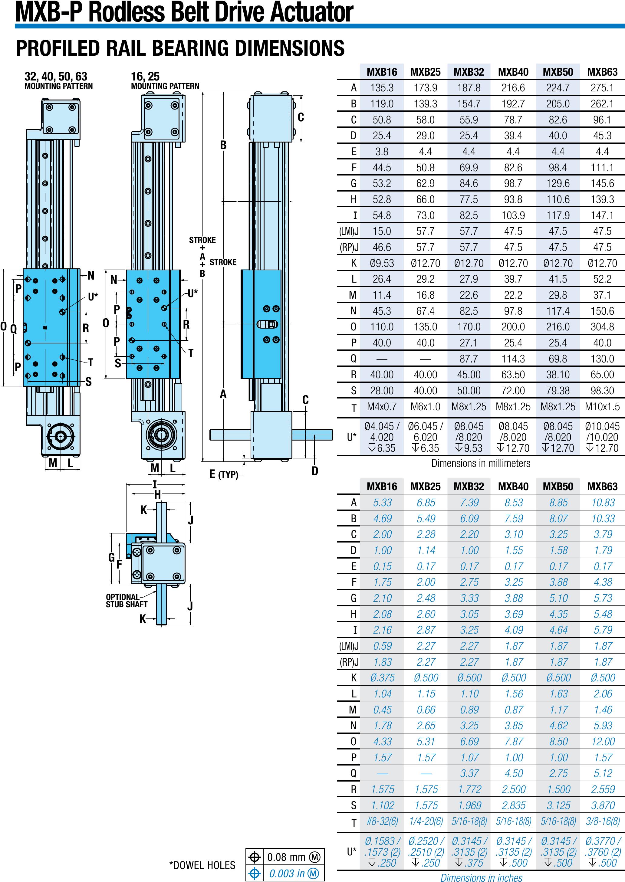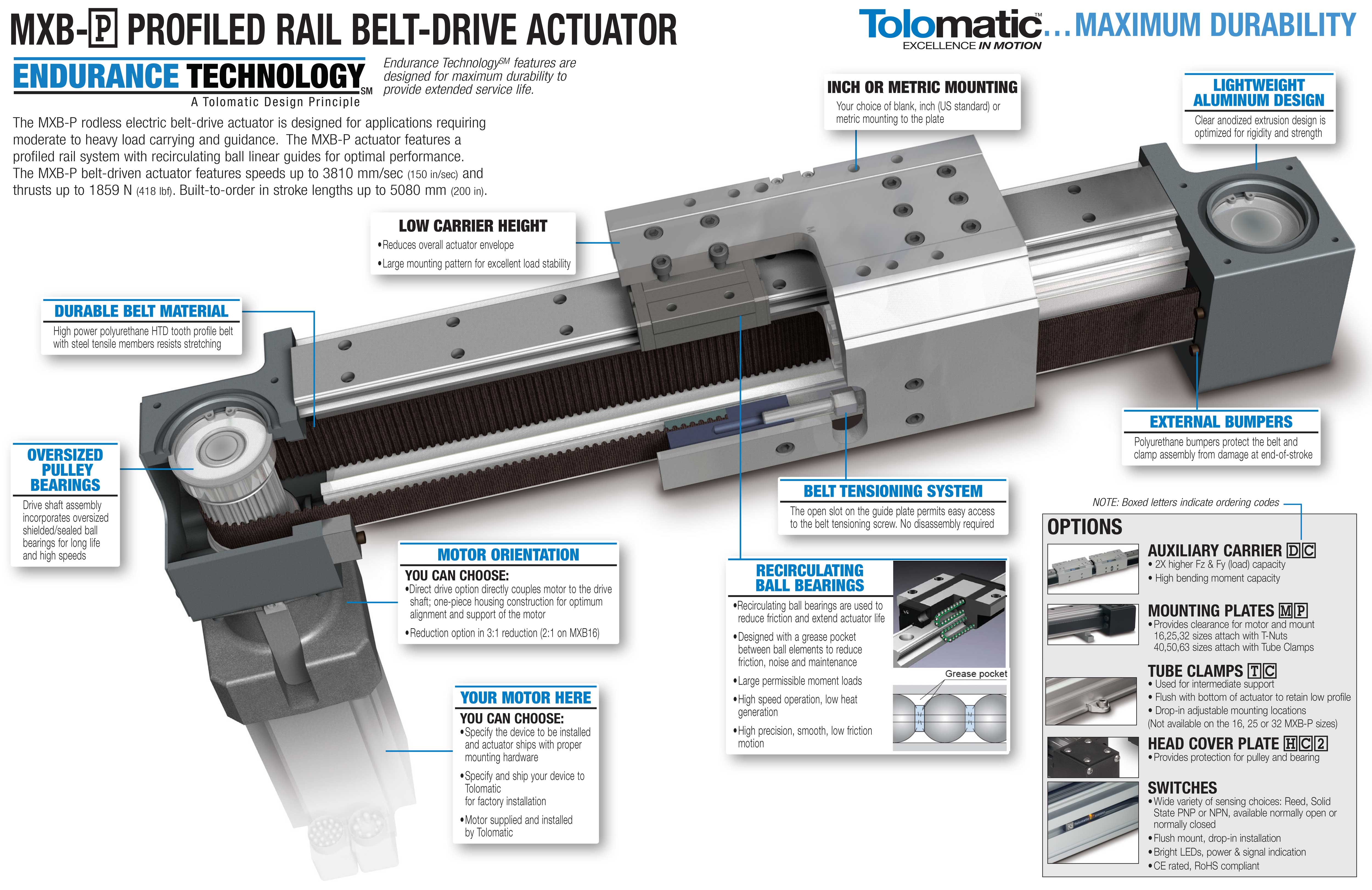 The MXB-P heavy duty linear actuator is designed for applications requiring moderate to heavy load carrying and guidance. The MXB-P actuator features a profiled rail system with recirculating ball linear guides and belt drive train for optimal performance and high speeds.