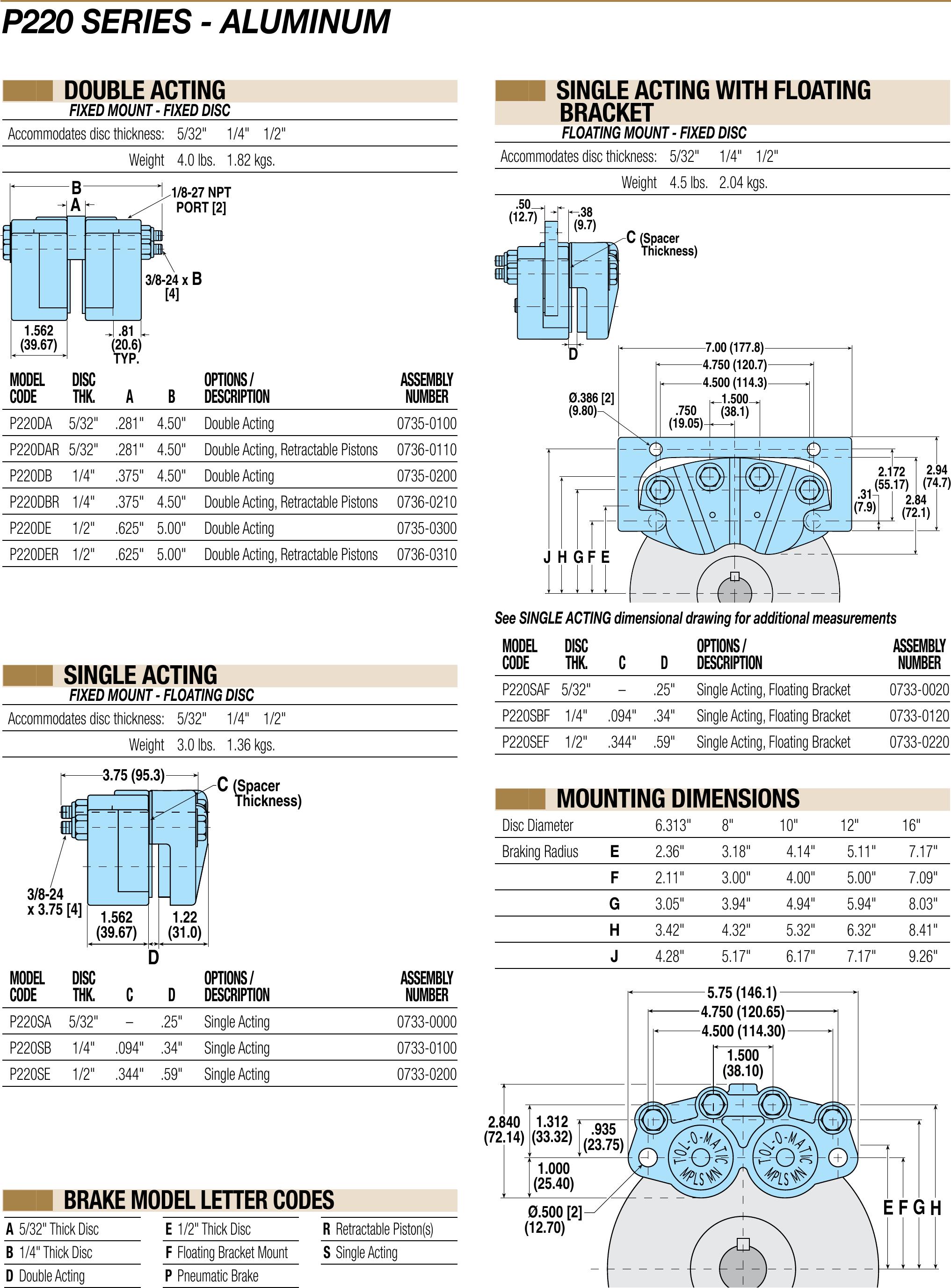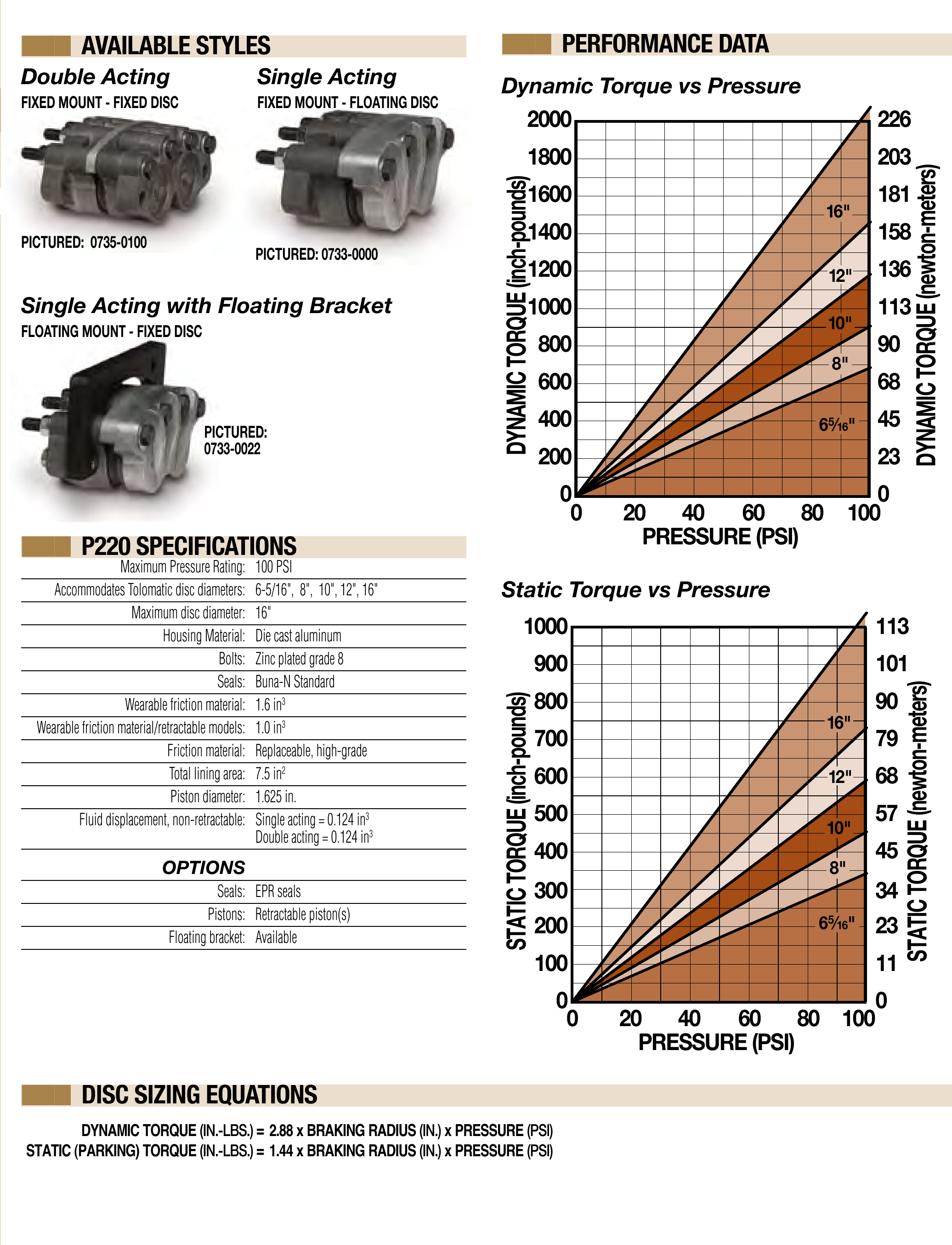 The P220 pneumatic brake series provides up to 2000 in-lbs (226 Nm) of torque at a maximum pressure of 100 PSI (6.9 bar). The P220 pneumatic brake series offers single acting and double acting models.