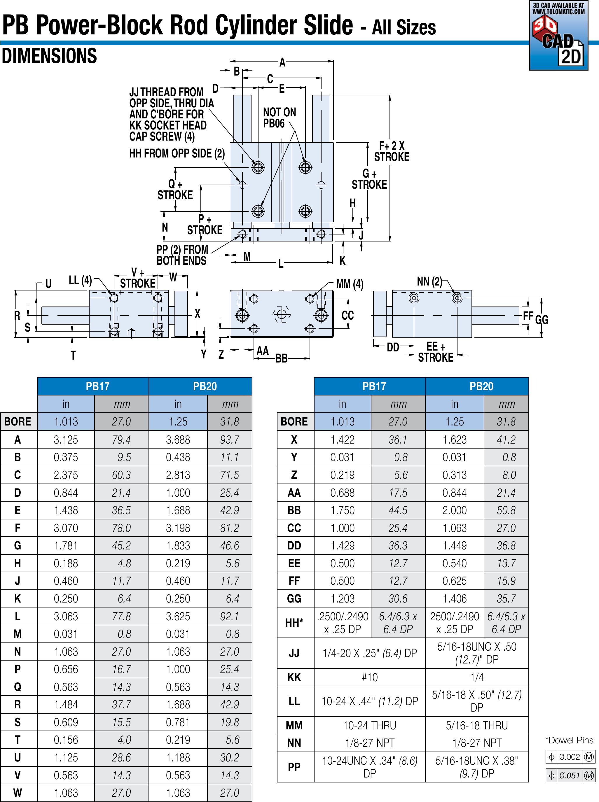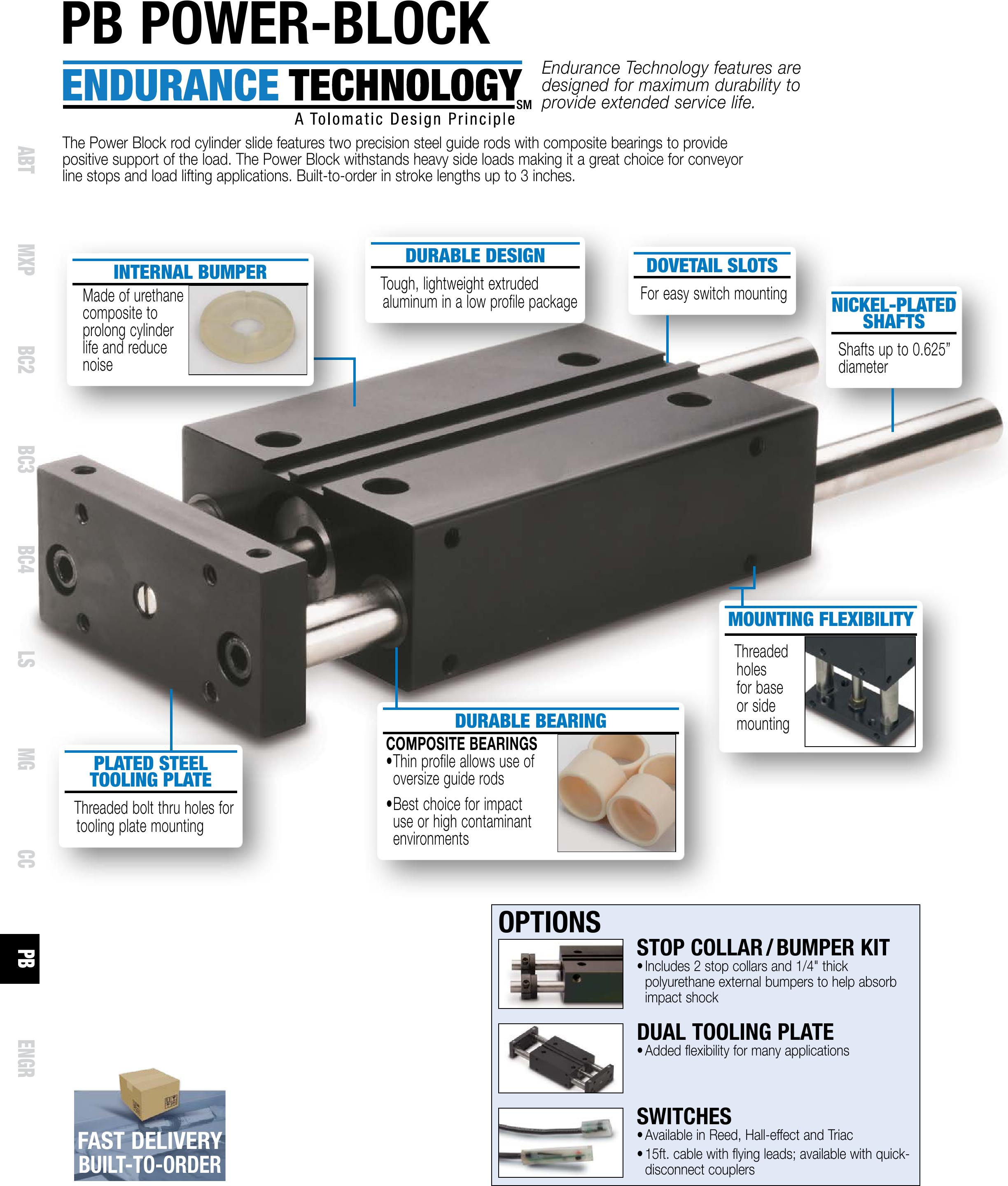 Loaded with standard features, the Power-Block pneumatic linear thruster is the ideal solution to a wide variety of short-stroke applications. Use alone or in conjunction with other Tolomatic linear actuators.