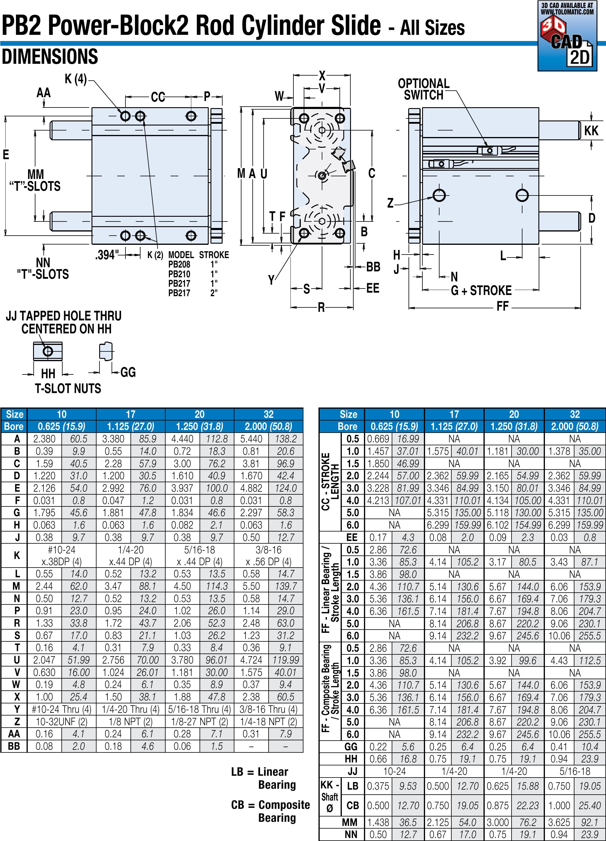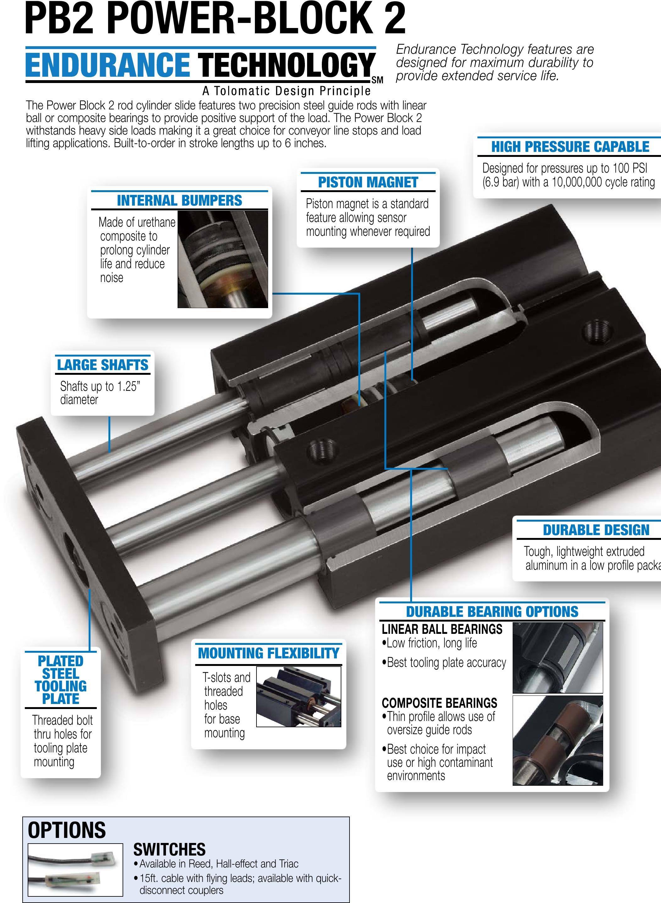 Tolomatic Power-Block 2 guided air cylinders provide increased power over the Power-Block series of thrusters. The longer stroke capablities make them good choices for a variety of pick-and-place and material handling applications.
