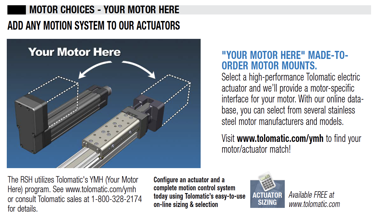 Tolomatic's line of hygienically designed all stainless steel electric actuators offer up to 7,943 lbf (35.3 kN) and they are the perfect solution for food and beverage applications where higher forces are required for pressing, pumping, cutting or slicing. Use the Tolomatic Your Motor Here® database to select from a wide variety of stainless steel motor manufacturers for a complete all stainless package.