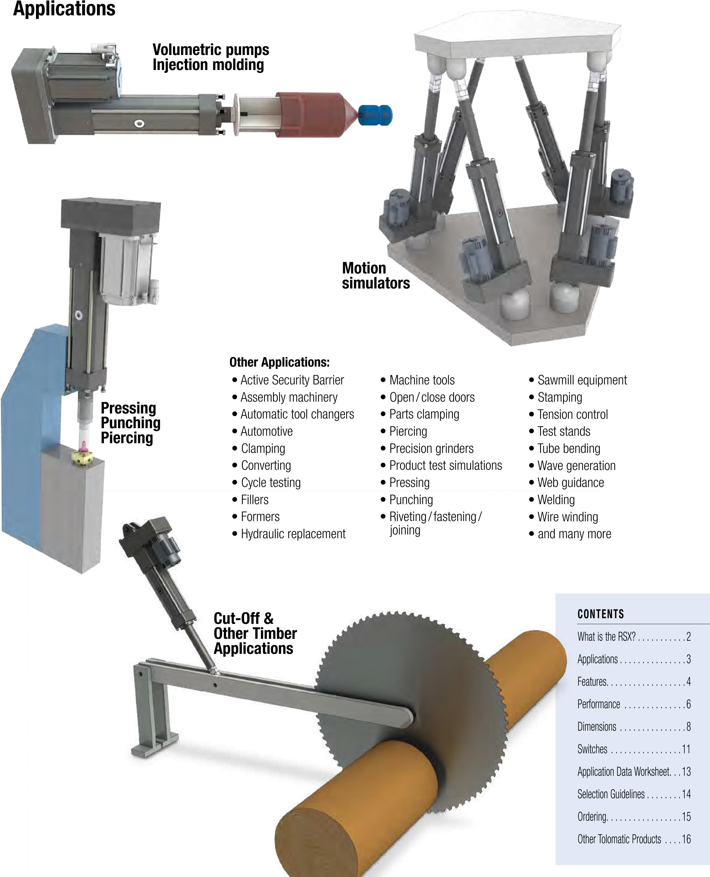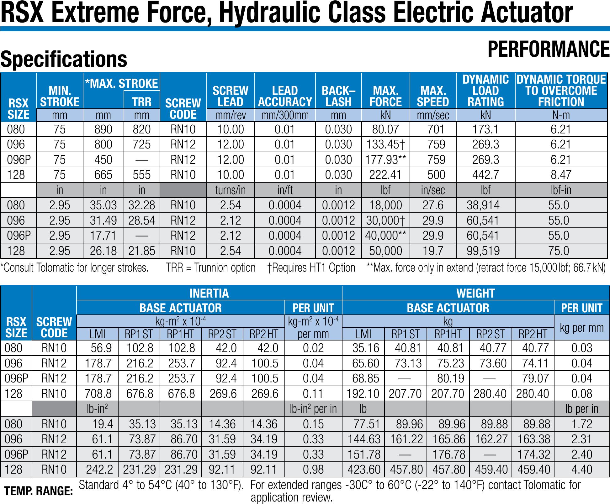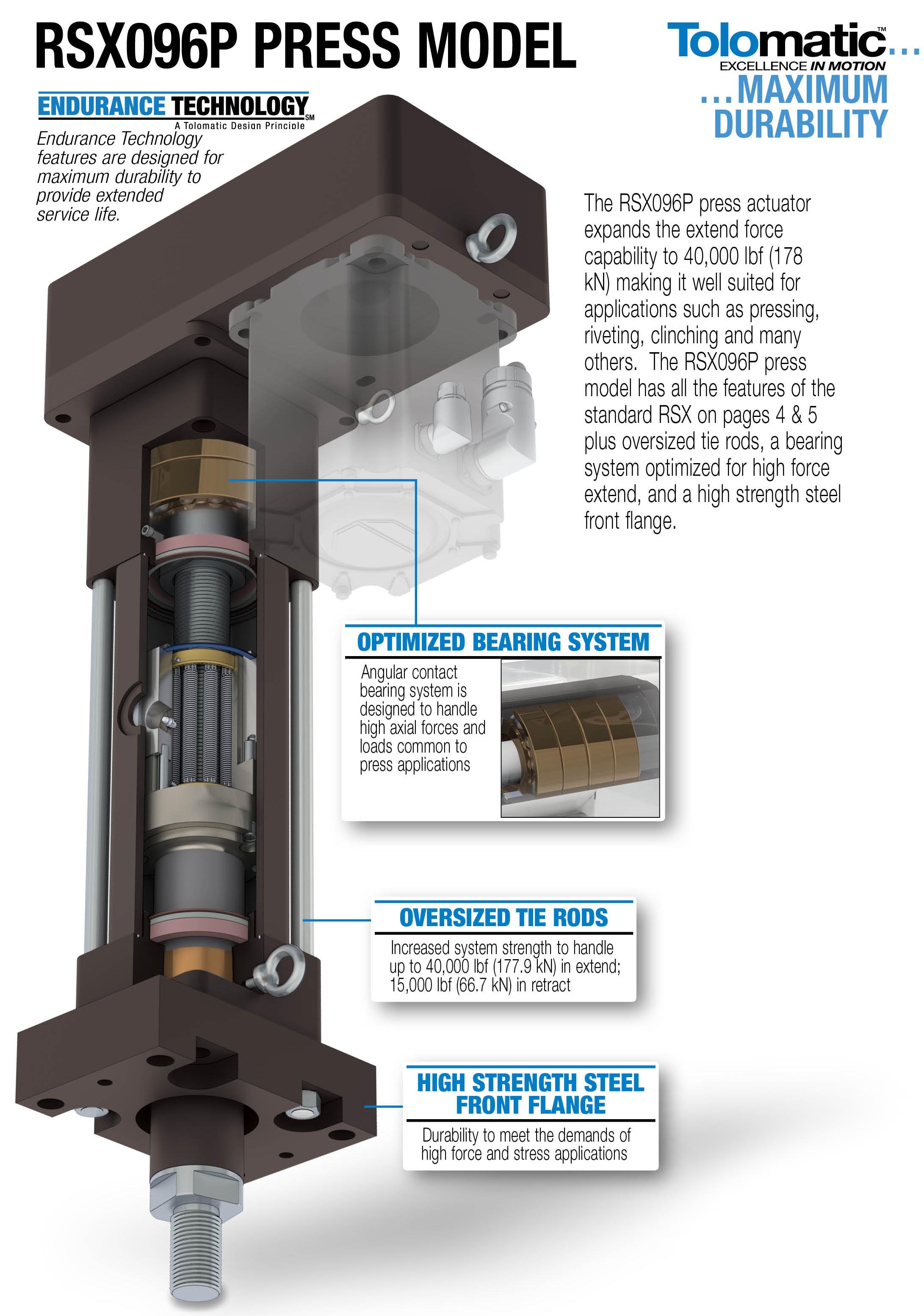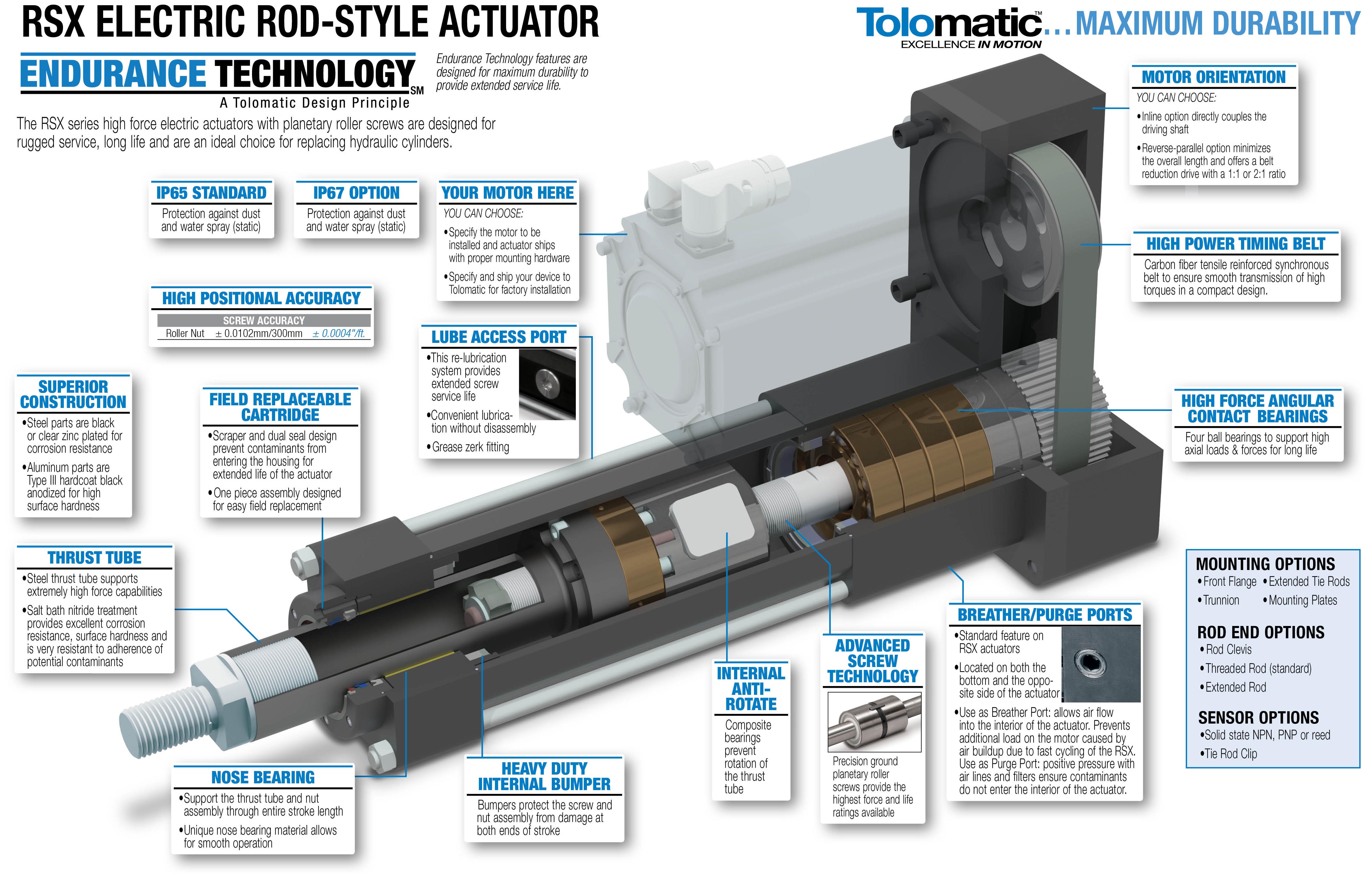 The RSX family of extreme force electric linear actuators are more efficient and offer increased precision compared to hydraulic cylinders. Tolomatic precision ground planetary roller screws are utilized to achieve long life and precision. The RSX platform is designed and tested for long life and reliable performance in demanding conditions including cold weather operation.